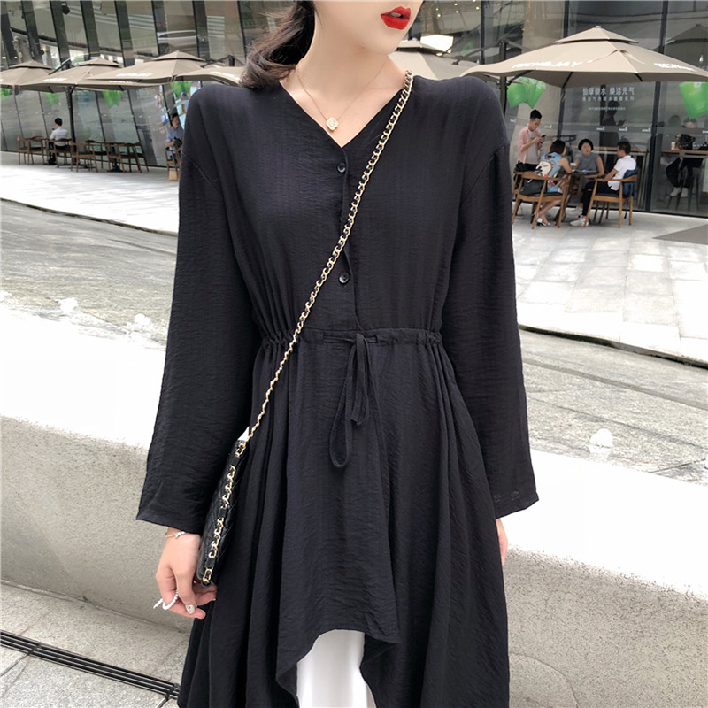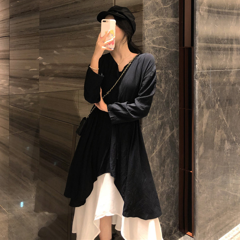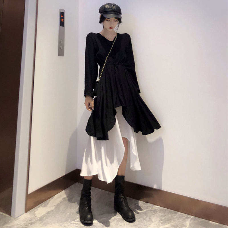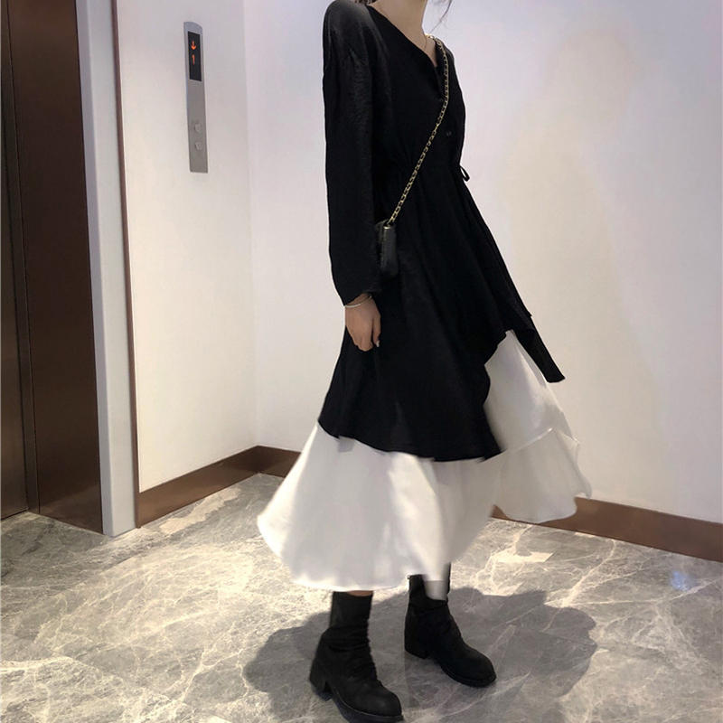 / 連衣裙女秋裝2018新款長袖桔梗裙港味寬松復古黑白拼接長裙子
