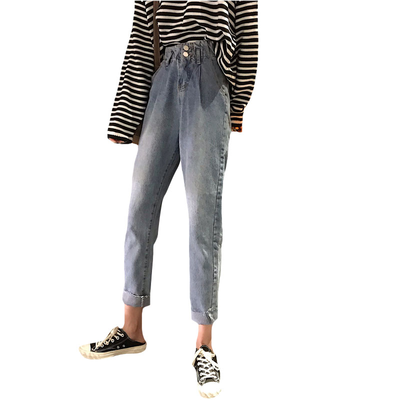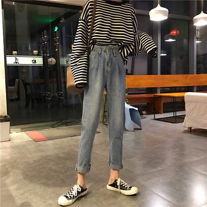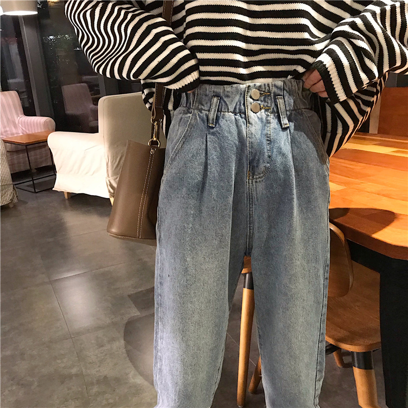 / 秋冬韓版水洗做舊松緊腰兩粒扣寬松牛仔褲高腰直筒褲闊腿褲長褲女