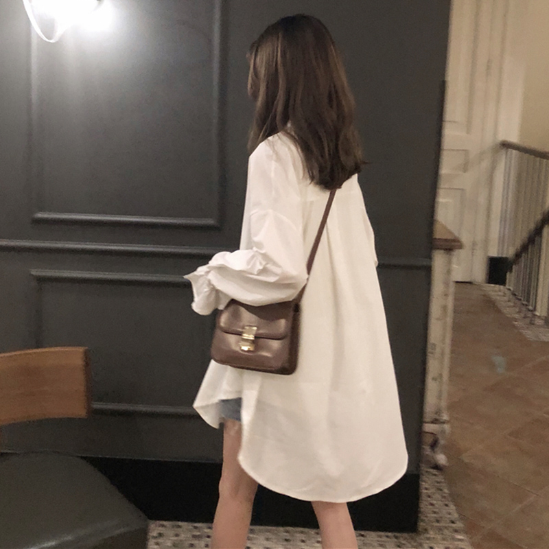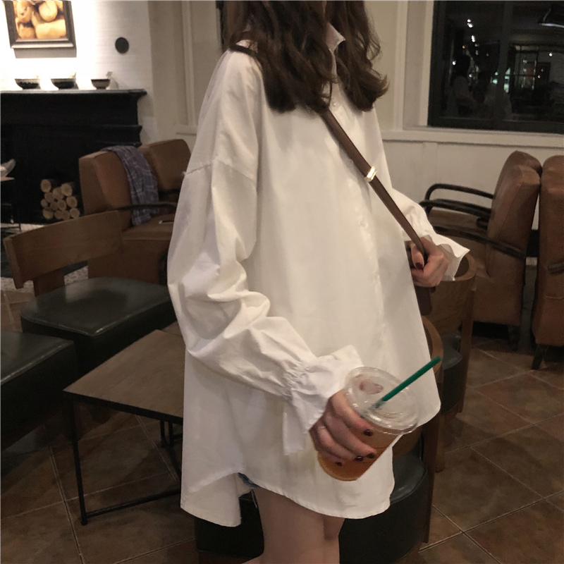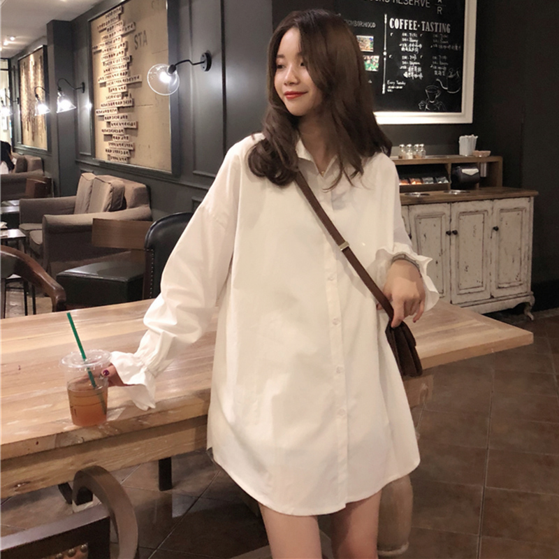 秋裝女2018新款韓版簡約寬松中長白襯衫學生休閑喇叭長袖上衣外套