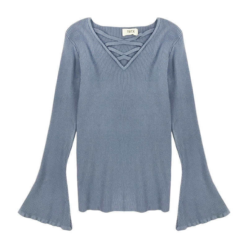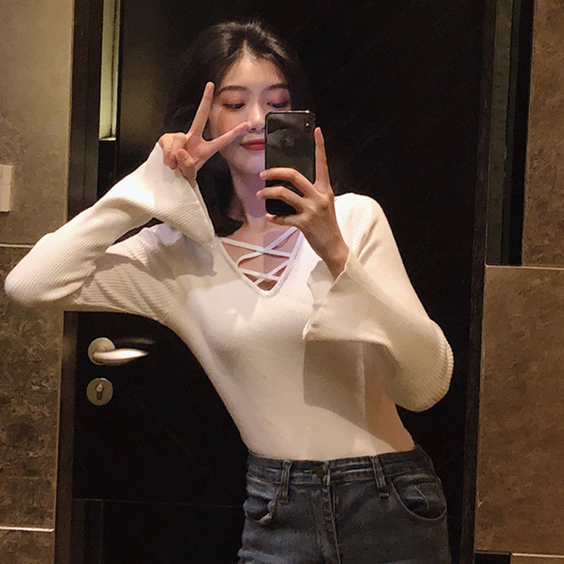 上衣女秋冬2018新款韓版修身長袖打底衫學生小心機交叉v領針織衫