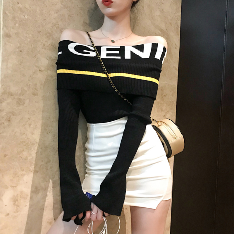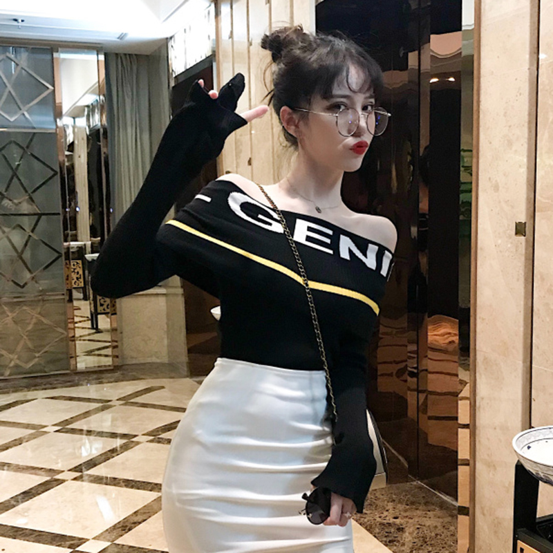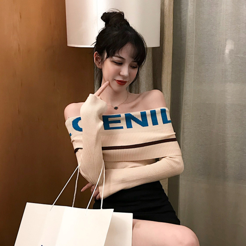 時尚字母針織衫秋裝女2018新款韓版氣質一字露肩長袖修身打底上衣