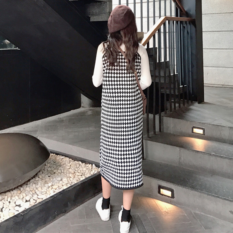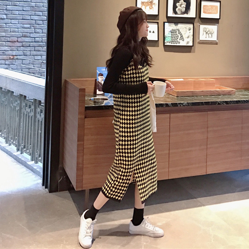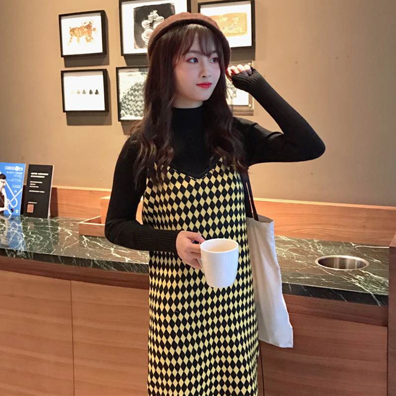 / 套裝女秋季新款菱形格子開叉吊帶針織裙修身半高領長袖打底衫T恤