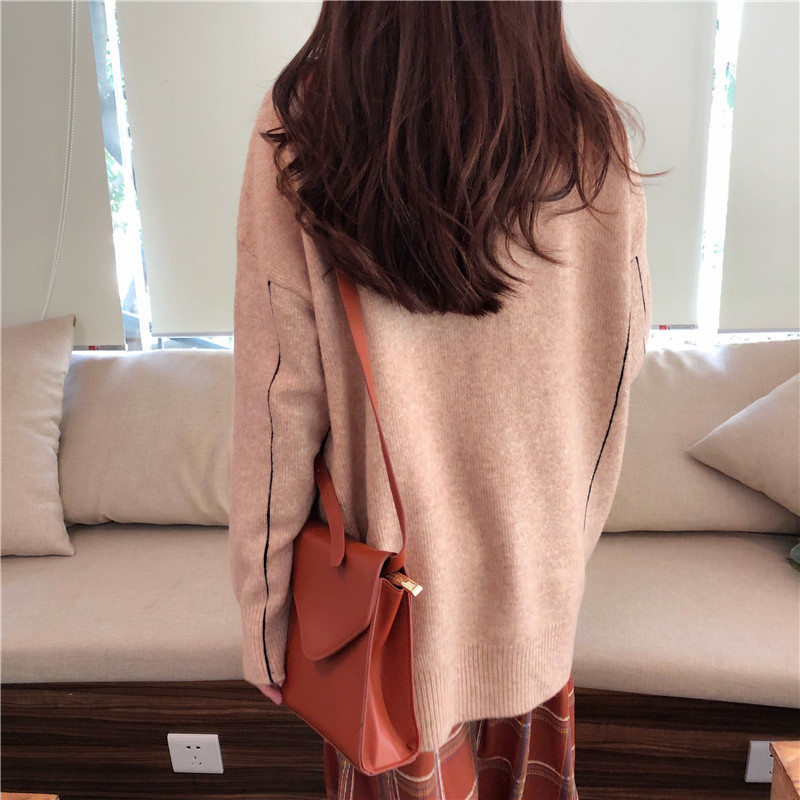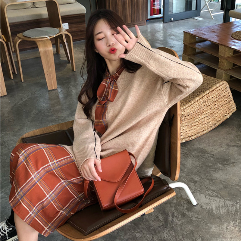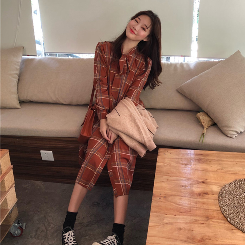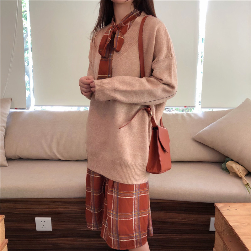 / 秋裝女2018新款系帶格子雪紡中長連衣裙子長袖毛衣寬松針織衫套裝