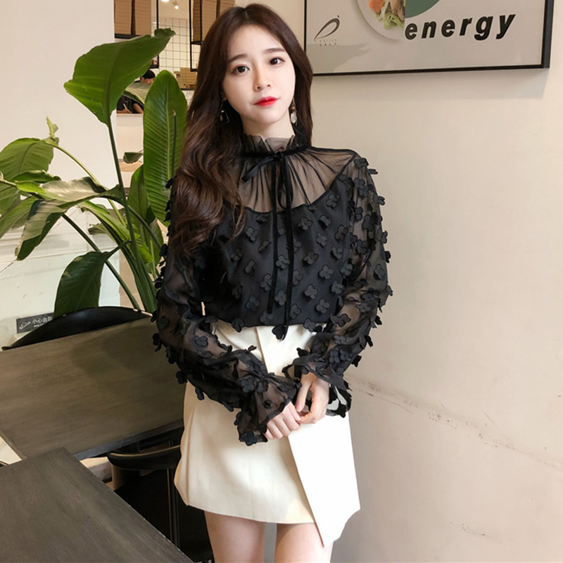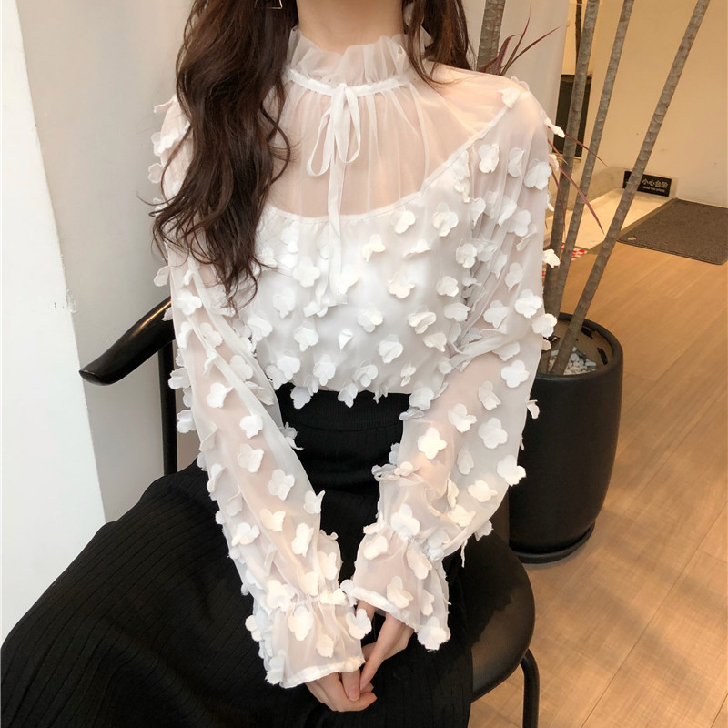 / 秋裝新款修身百搭系帶網紗打底上衣女韓版喇叭長袖花朵裝飾雪紡衫