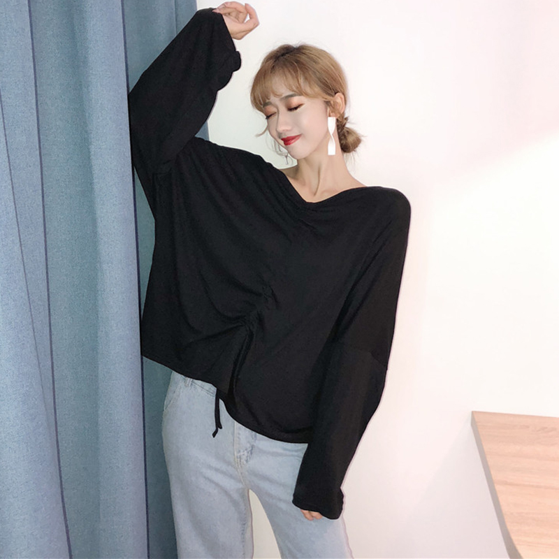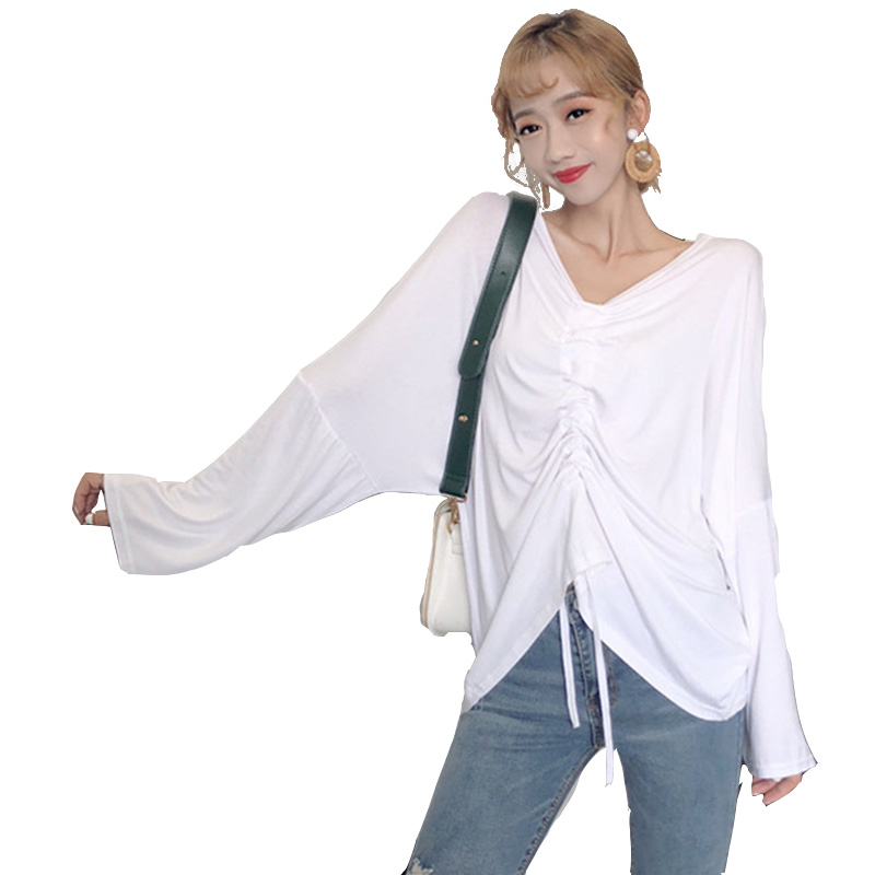 / 上衣女早秋2018新款韓版女裝寬松抽繩褶皺V領長袖露背T恤白色罩衫