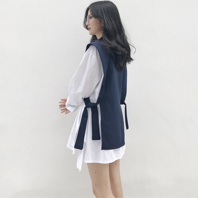 / 兩件套裝女裝早秋新款韓版寬松顯瘦側開叉長袖襯衣+純色披肩馬甲