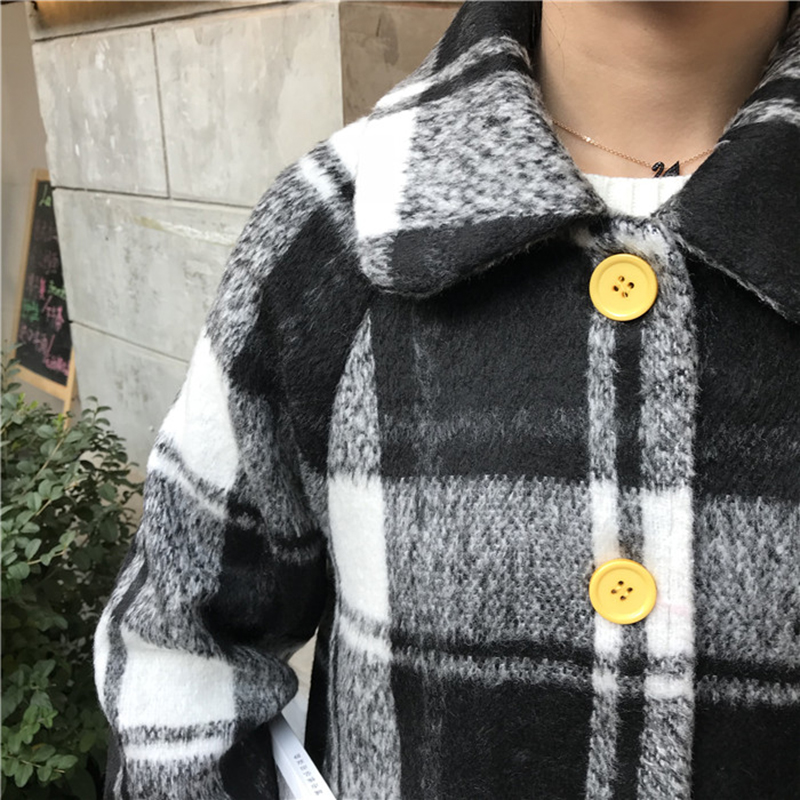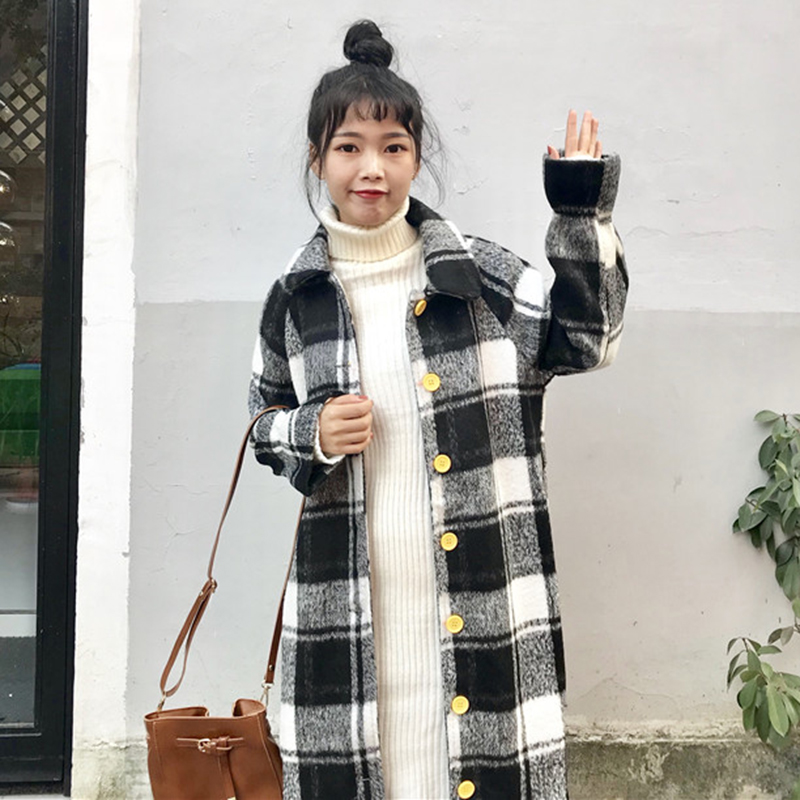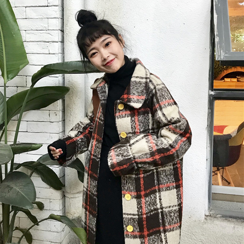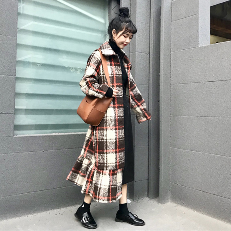 / 秋裝女2018新款復古格子荷葉邊保暖外套長款大衣寬松喇叭長袖上衣