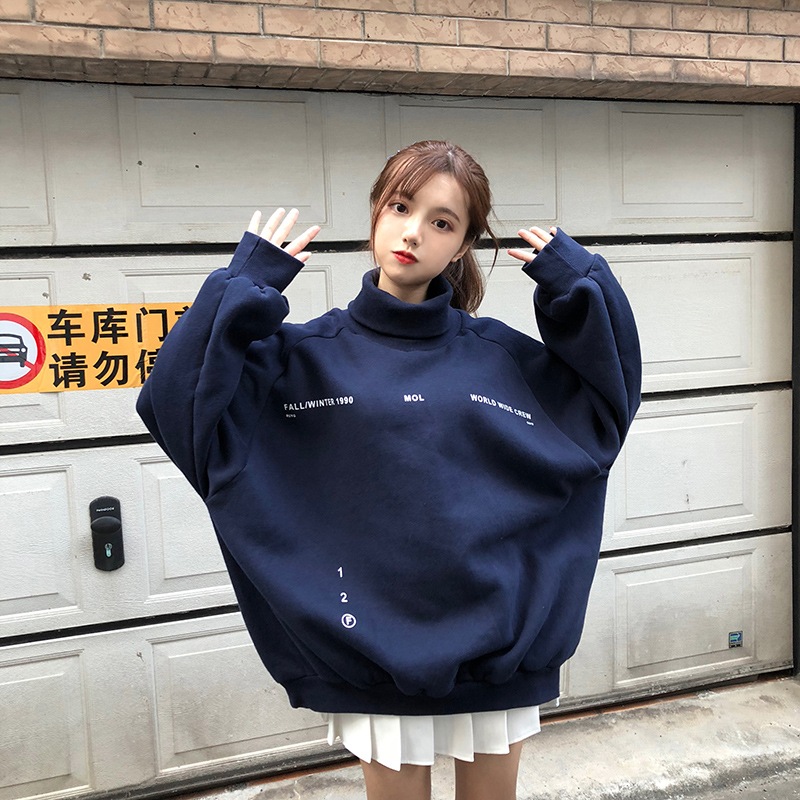 秋冬韓版寬松慵懶風字母高領加絨加厚保暖套頭超火衛衣上衣外套女