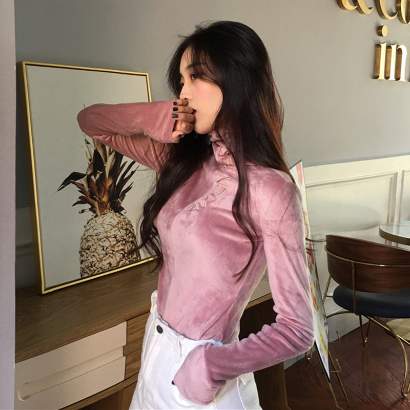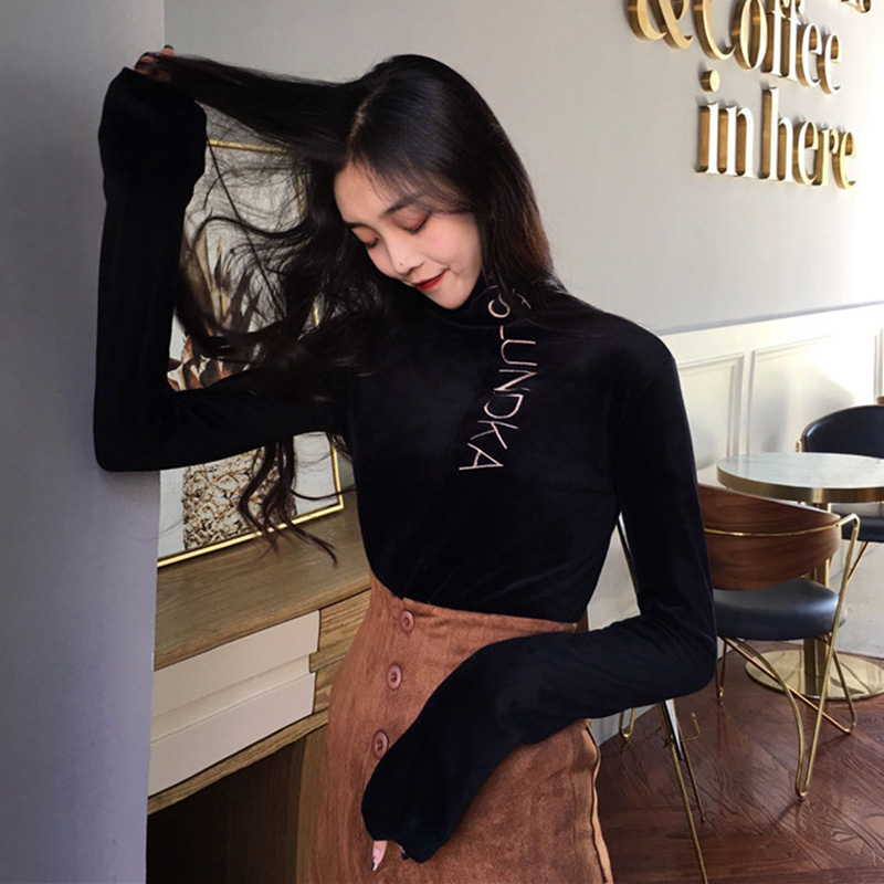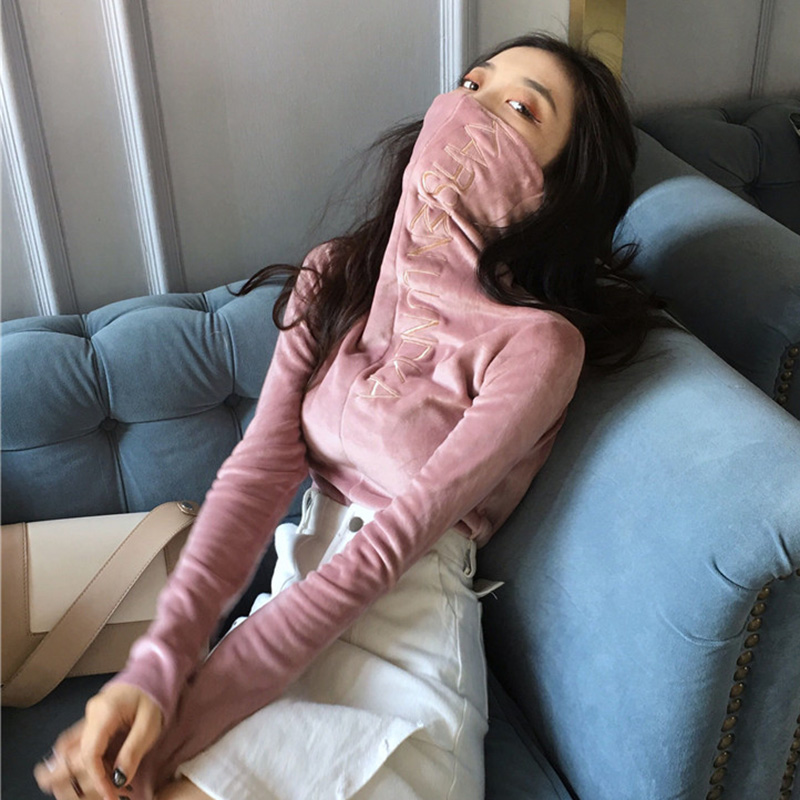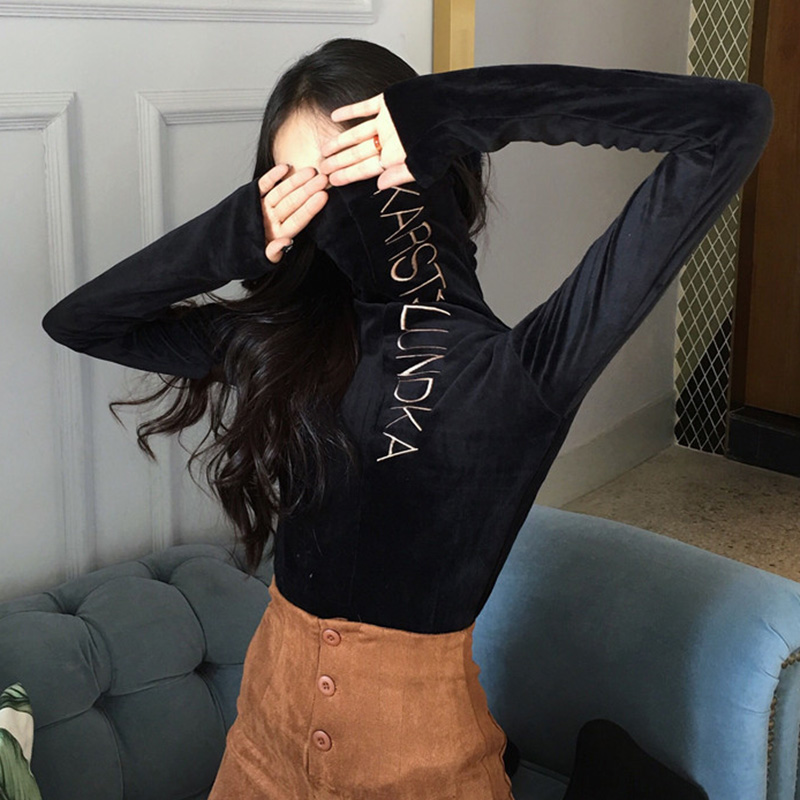 時尚字母刺繡高領長袖T恤秋裝女2018新款氣質修身顯瘦打底衫上衣