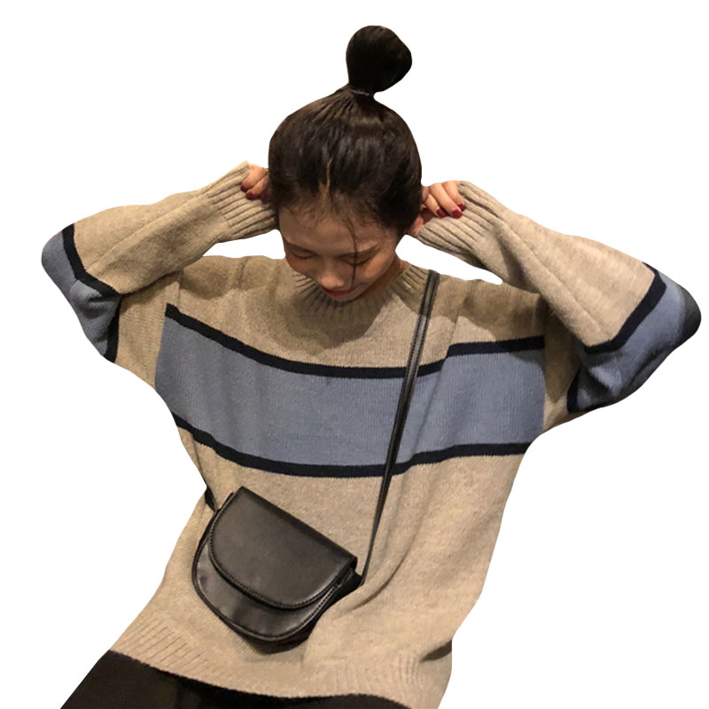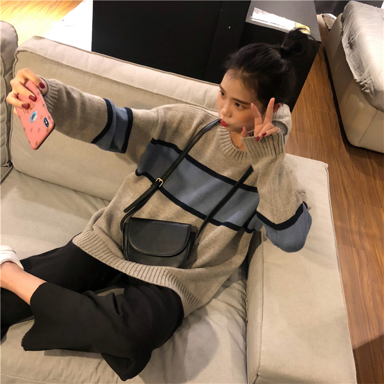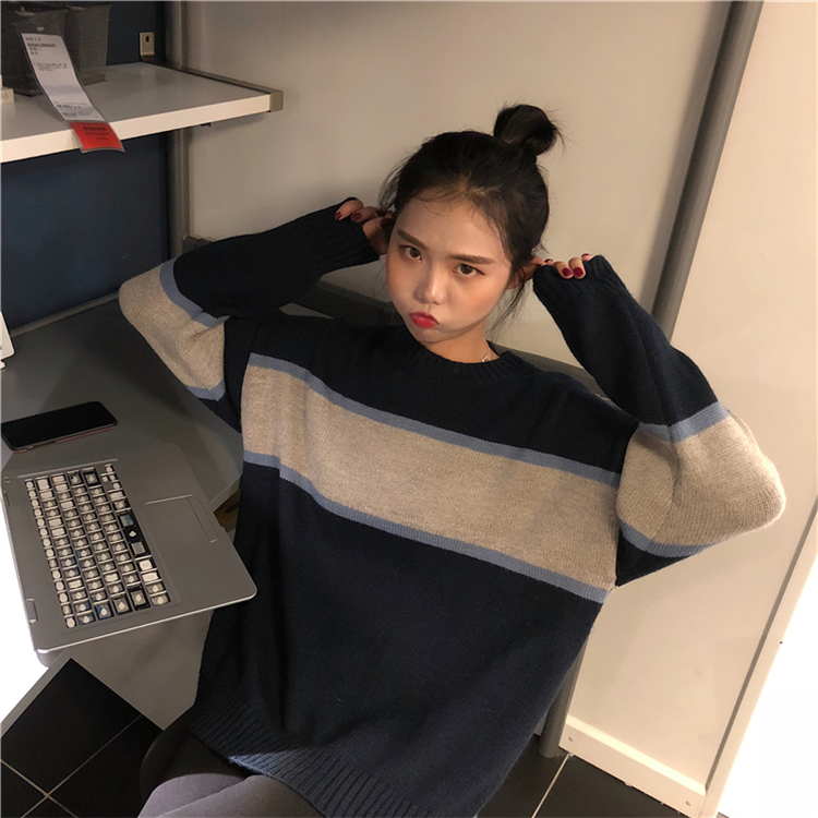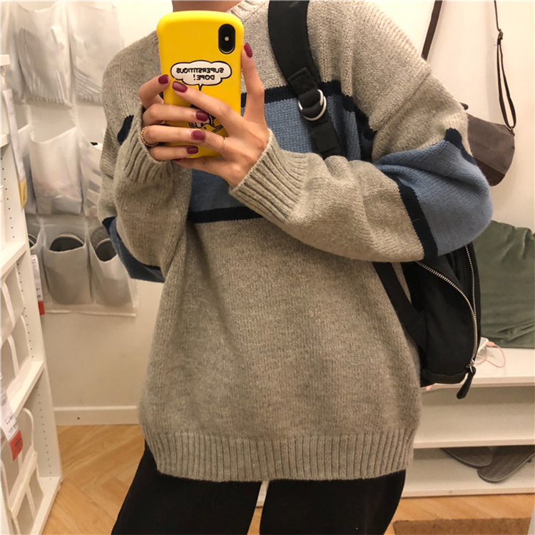 / 秋冬女裝韓版chic慵懶風撞色寬松網紅套頭超火針織衫毛衣上衣外套