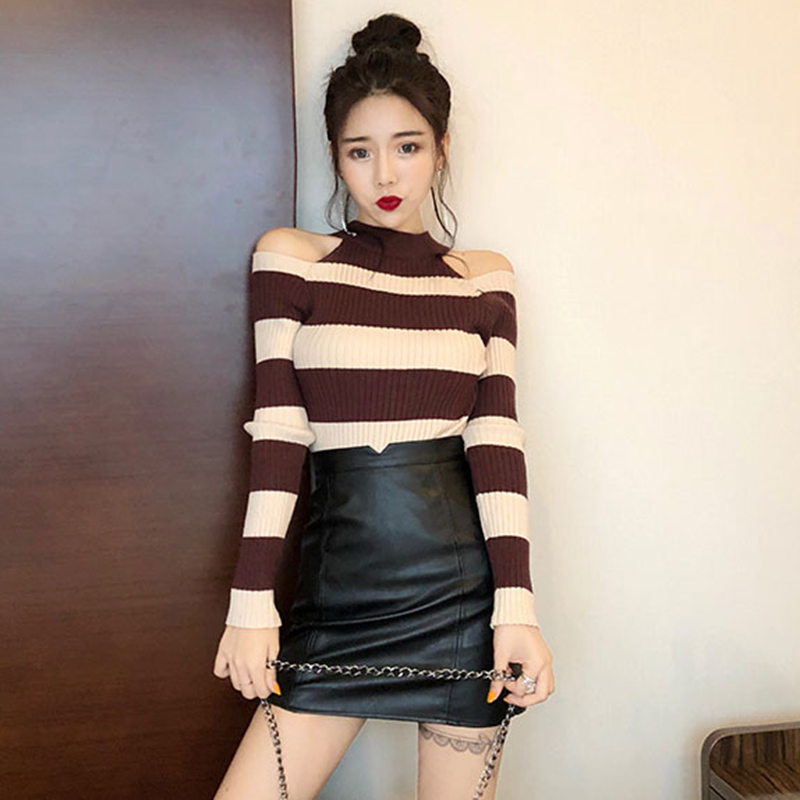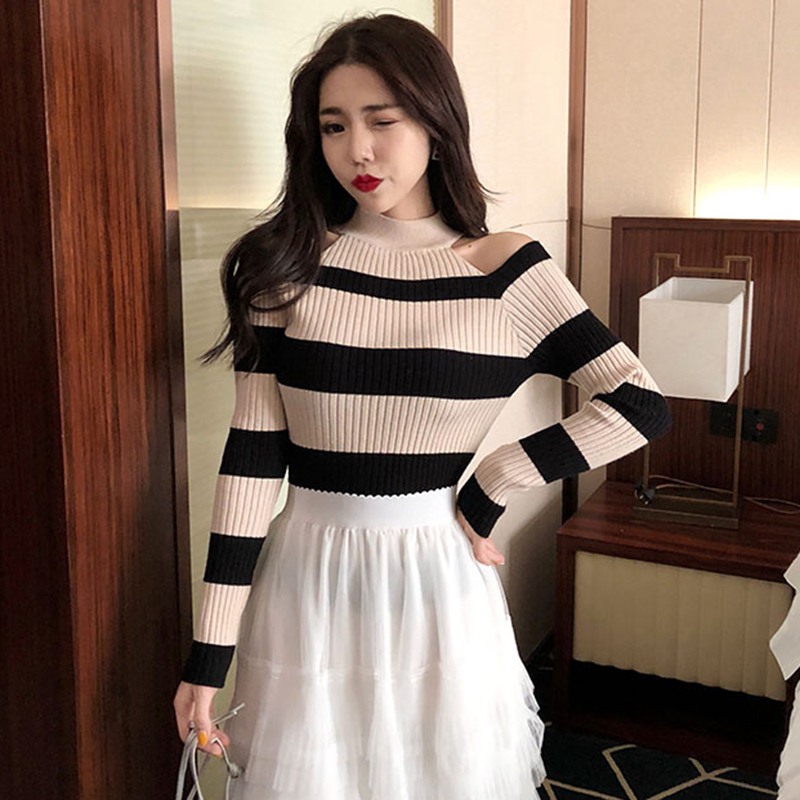 chic長袖打底針織衫女秋冬裝2018新款韓版撞色條紋心機露肩薄毛衣