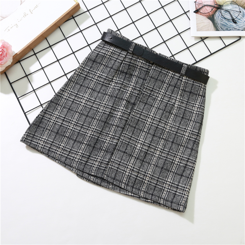 復古格子腰帶高腰顯瘦短裙秋裝女2018新款紐扣裝飾學生A字半身裙