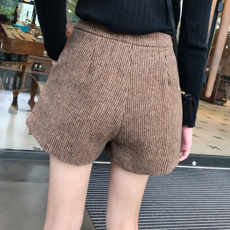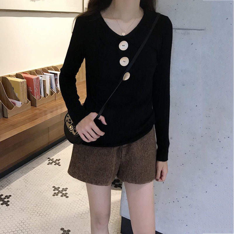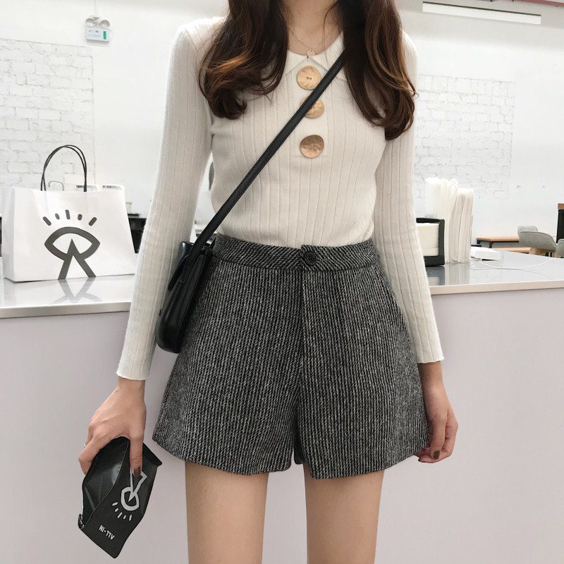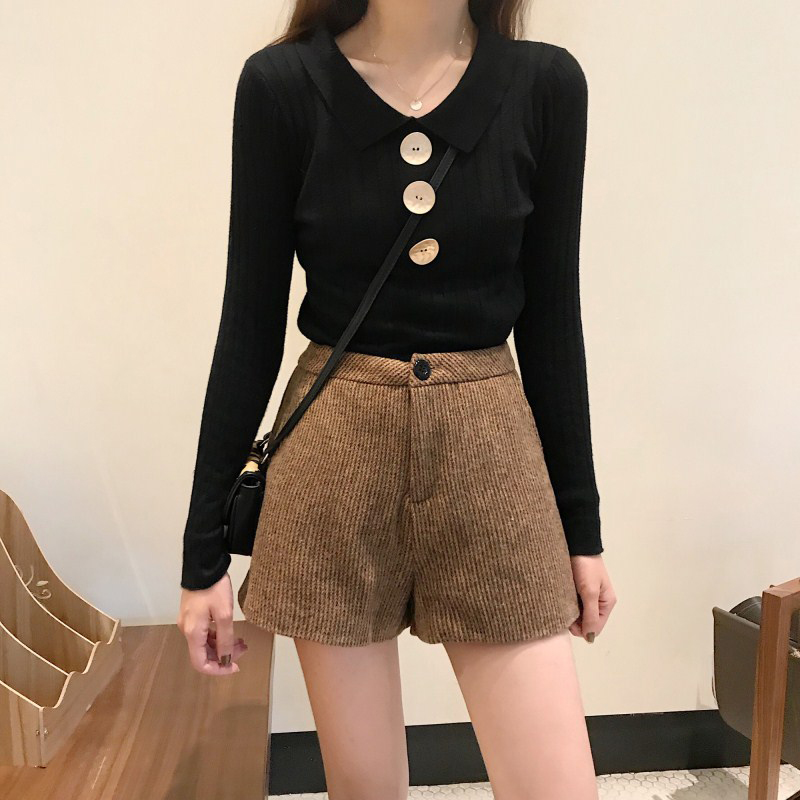 / 秋裝新款修身翻領大紐扣針織打底衫上衣休閑高腰毛呢短靴褲套裝女