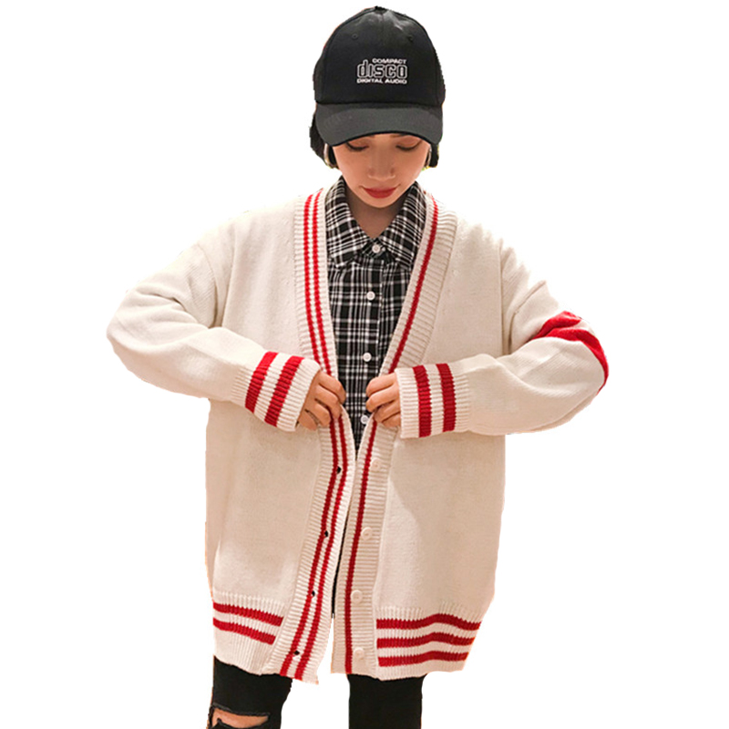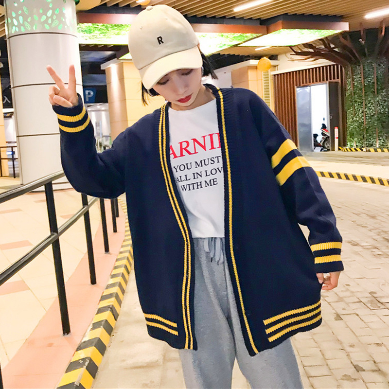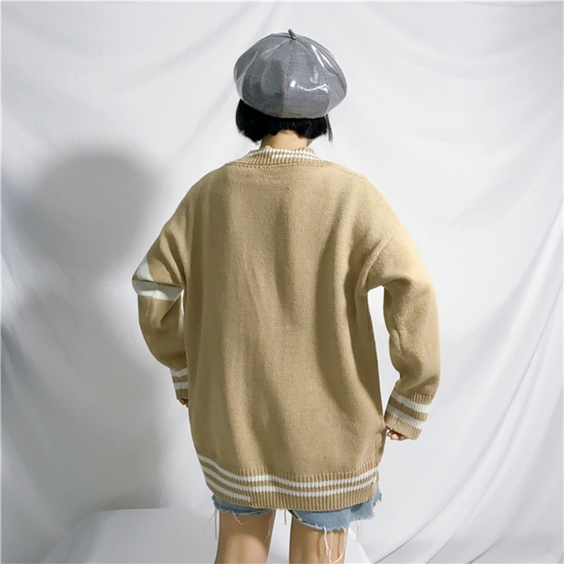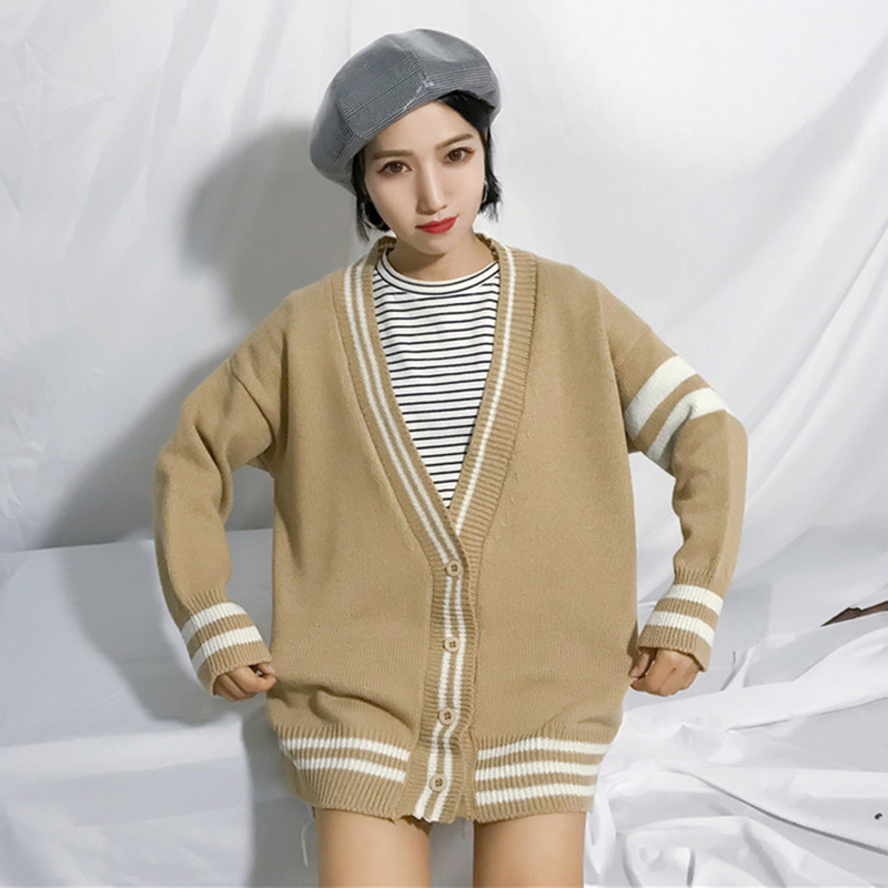 / 秋裝新款學生時尚排扣開衫毛衣女韓版寬松V領條紋長袖針織外套潮