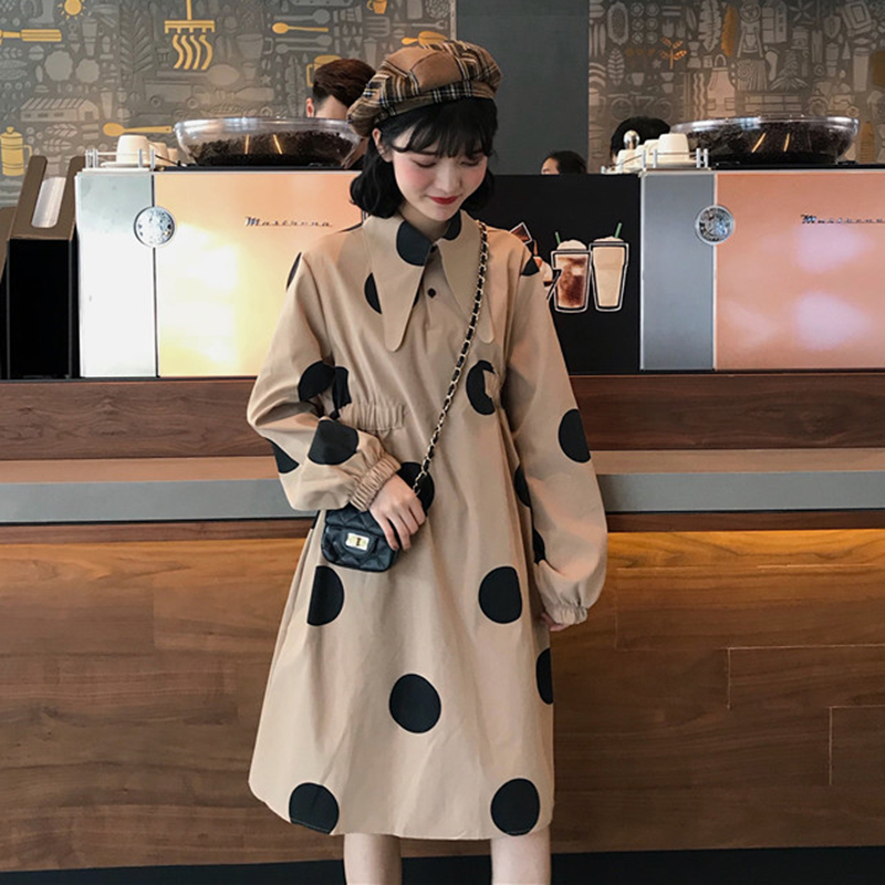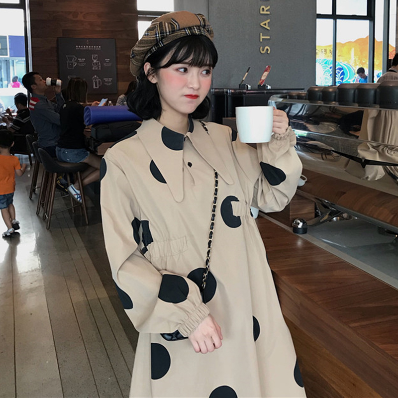 秋裝女2018新款韓版chic風大波點長袖連衣裙學生時尚中長A字裙子