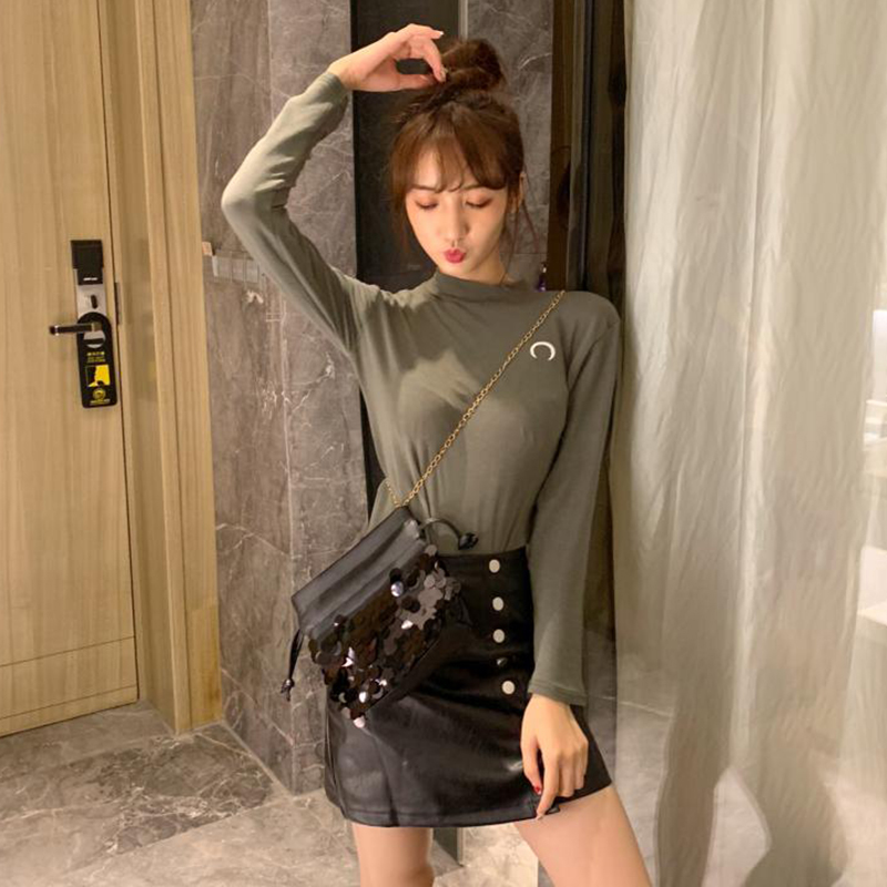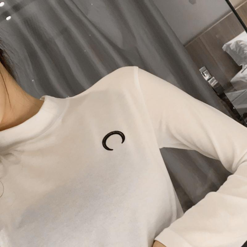 / 半高領長袖打底衫女修身顯瘦刺繡白T恤上衣秋裝新款學生體恤衣服