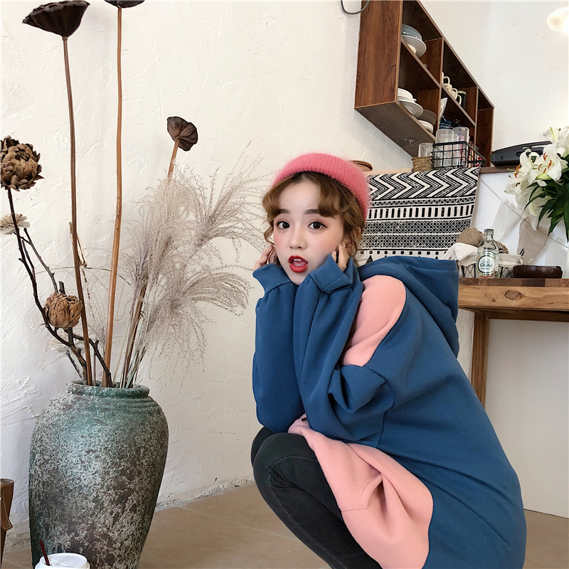 / 秋冬女裝韓版中長款慵懶風拼色寬松刺繡字母連帽套頭衛衣上衣外套