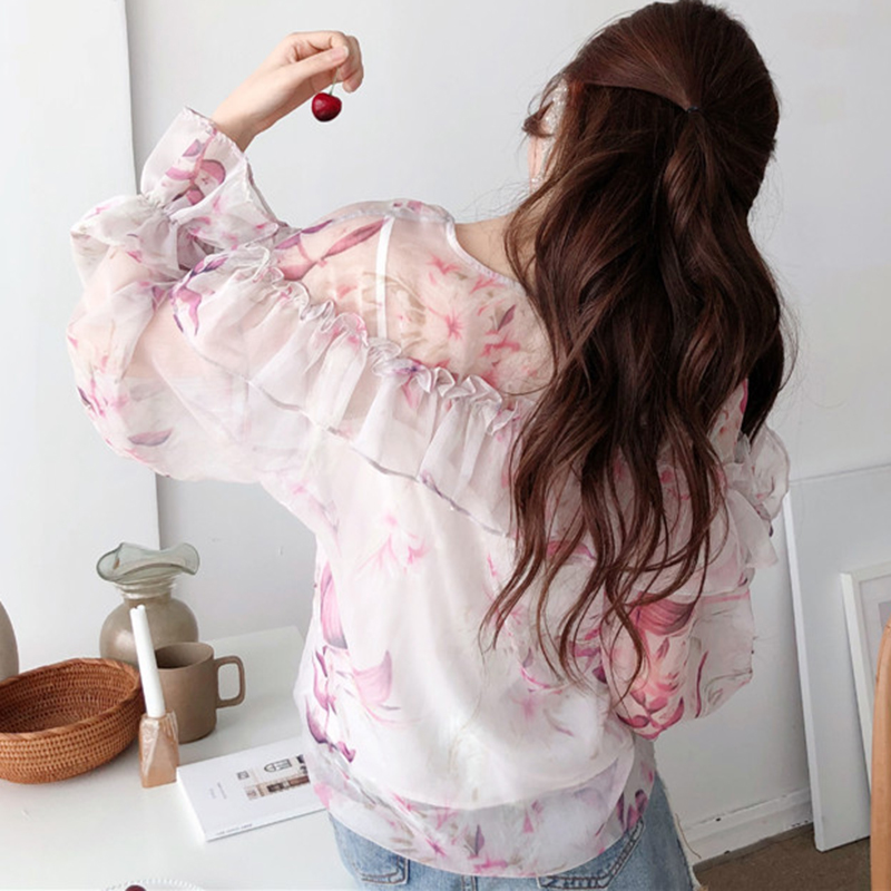 / 氣質套裝女2018夏季新款女裝韓版寬松顯瘦V領燈籠長袖碎花雪紡衫