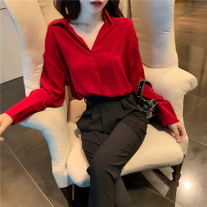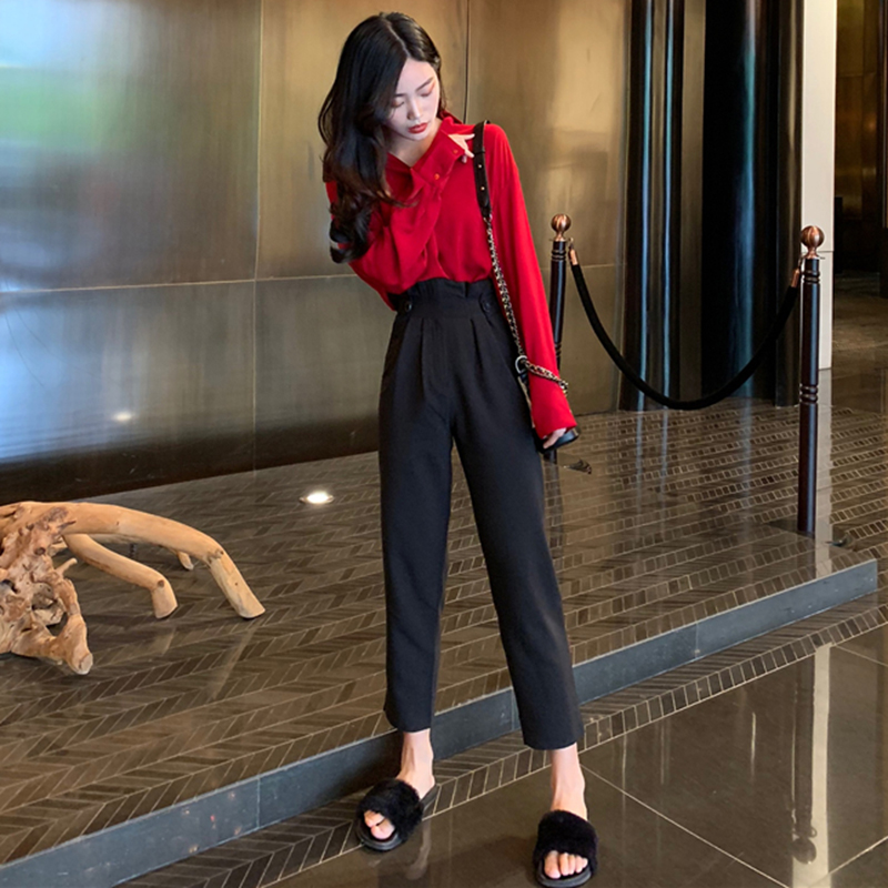 / 兩件套裝女秋冬時尚V領紅色長袖襯衫高腰顯瘦九分褲休閑西裝褲子