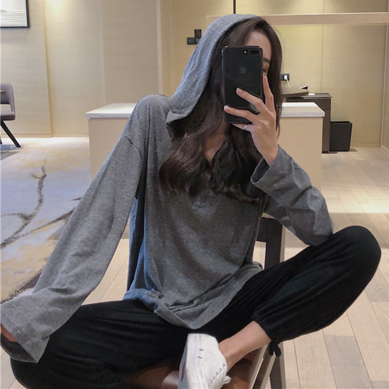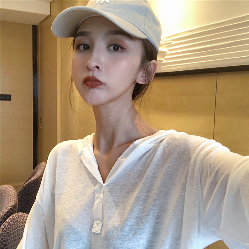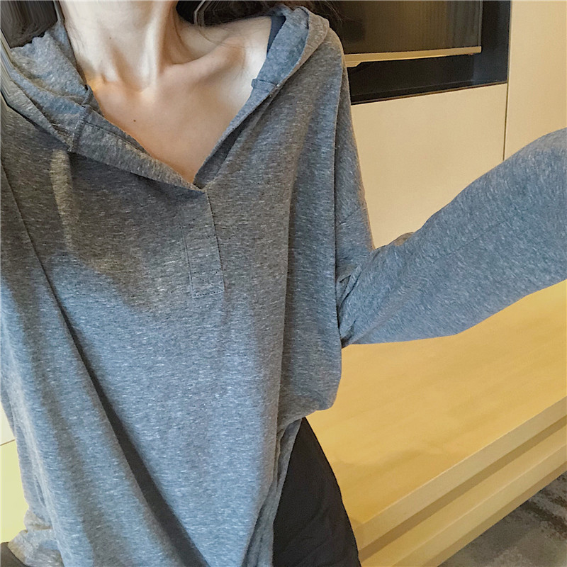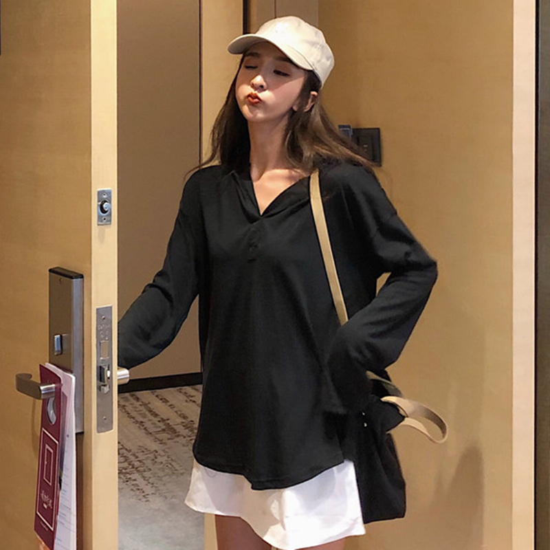 秋冬女裝2018新款學生寬松V領連帽罩衫時尚白色T恤休閑長袖上衣潮