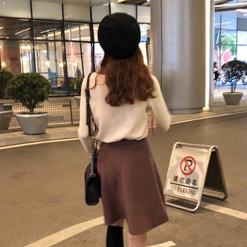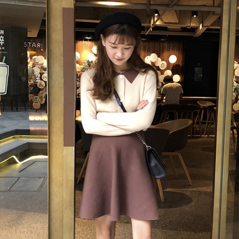 / 套裝女早秋新款復古小翻領撞色長袖針織衫+高腰針織半身裙兩件套