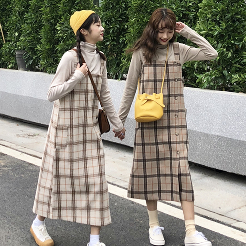 / 學院風套裝女秋2018新款開叉格子背帶連衣裙子修身長袖針織打底衫