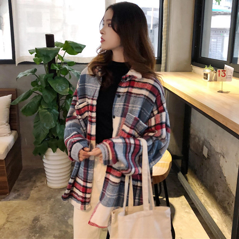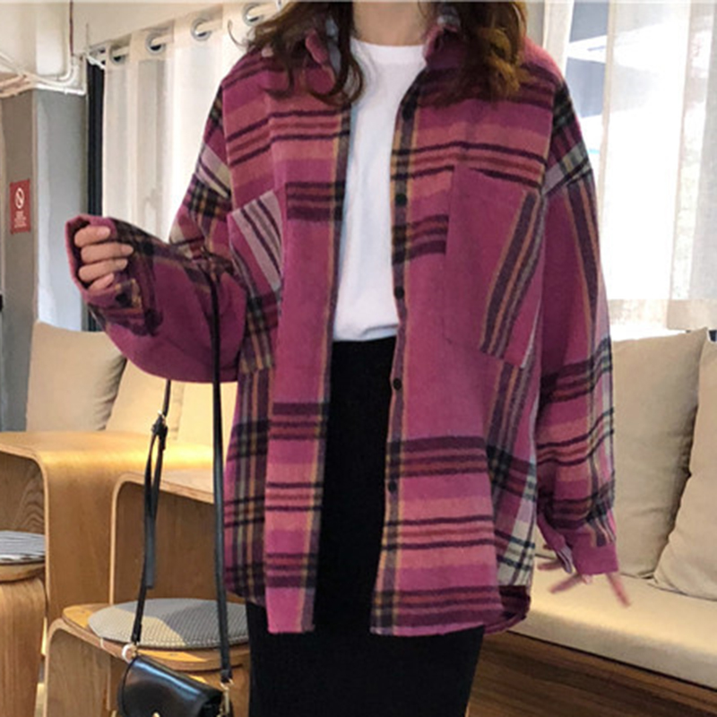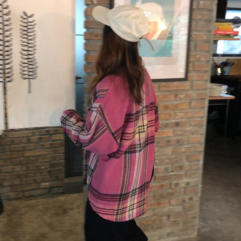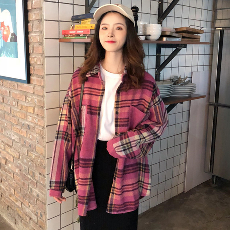/ 復古毛呢格子襯衫秋裝女2018新款韓版時尚寬松長袖上衣中長款外套