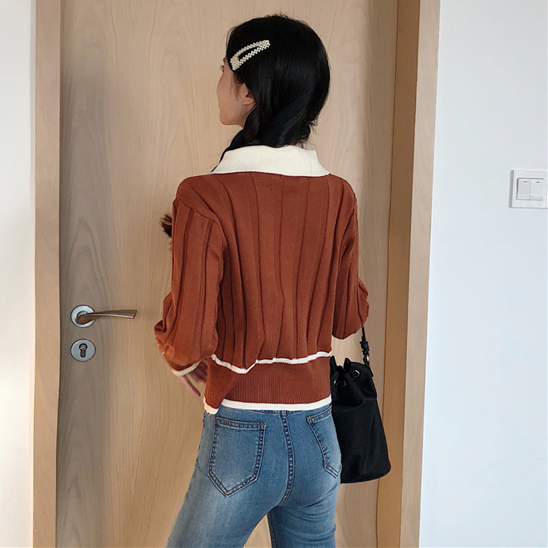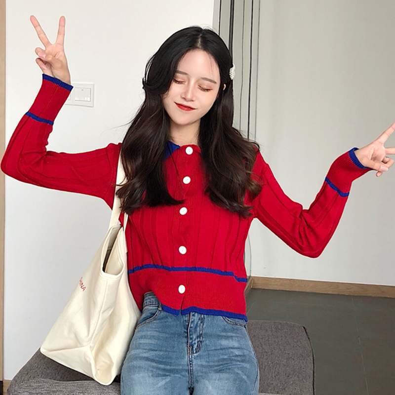 / 新款秋裝女復古修身拼色長袖毛衣時尚氣質慵懶小開衫學生打底上衣
