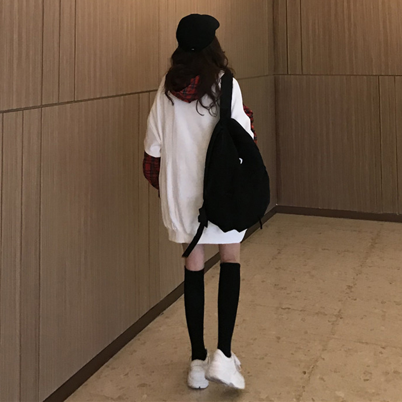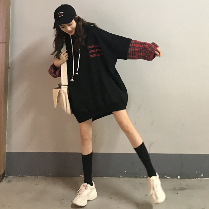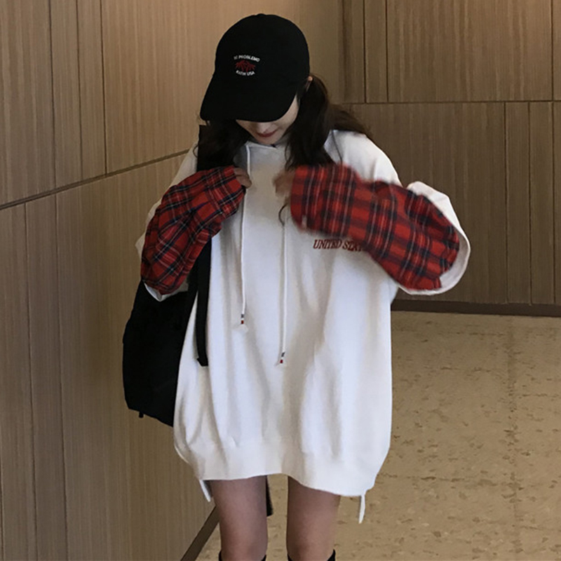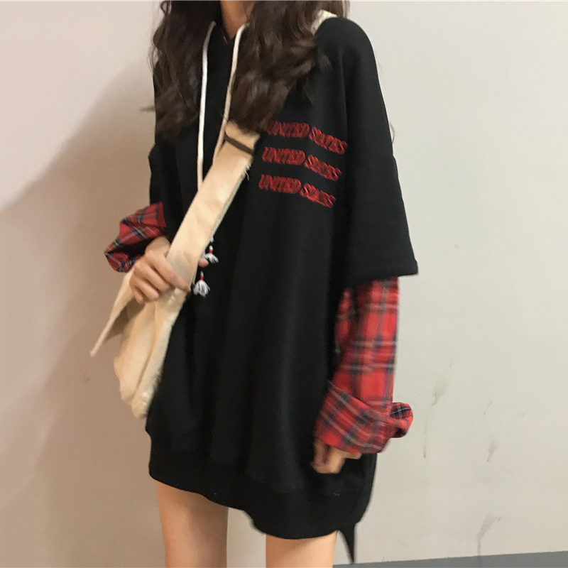 時尚拼接格子假兩件外套秋裝女2018新款套頭衛衣學生寬松長袖上衣