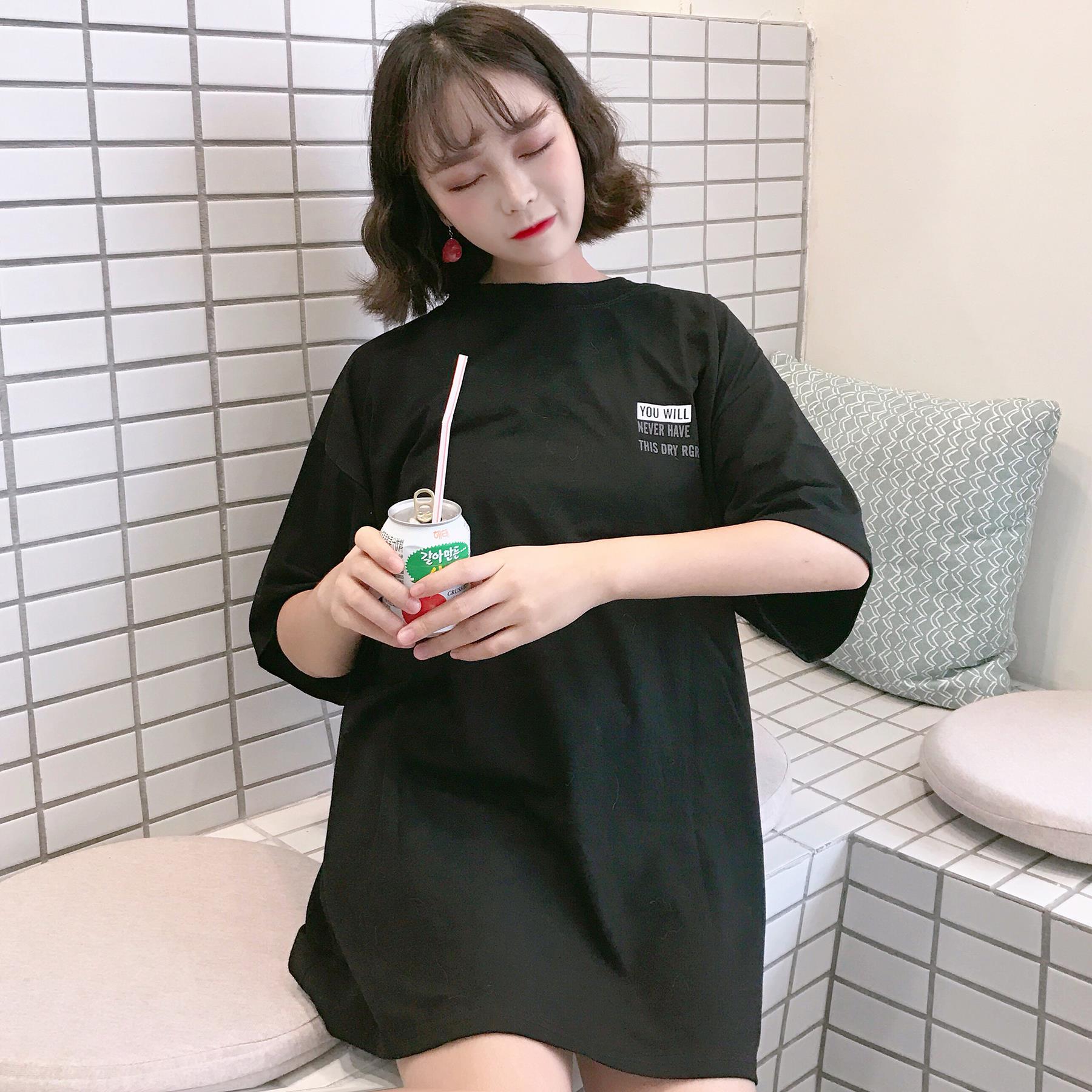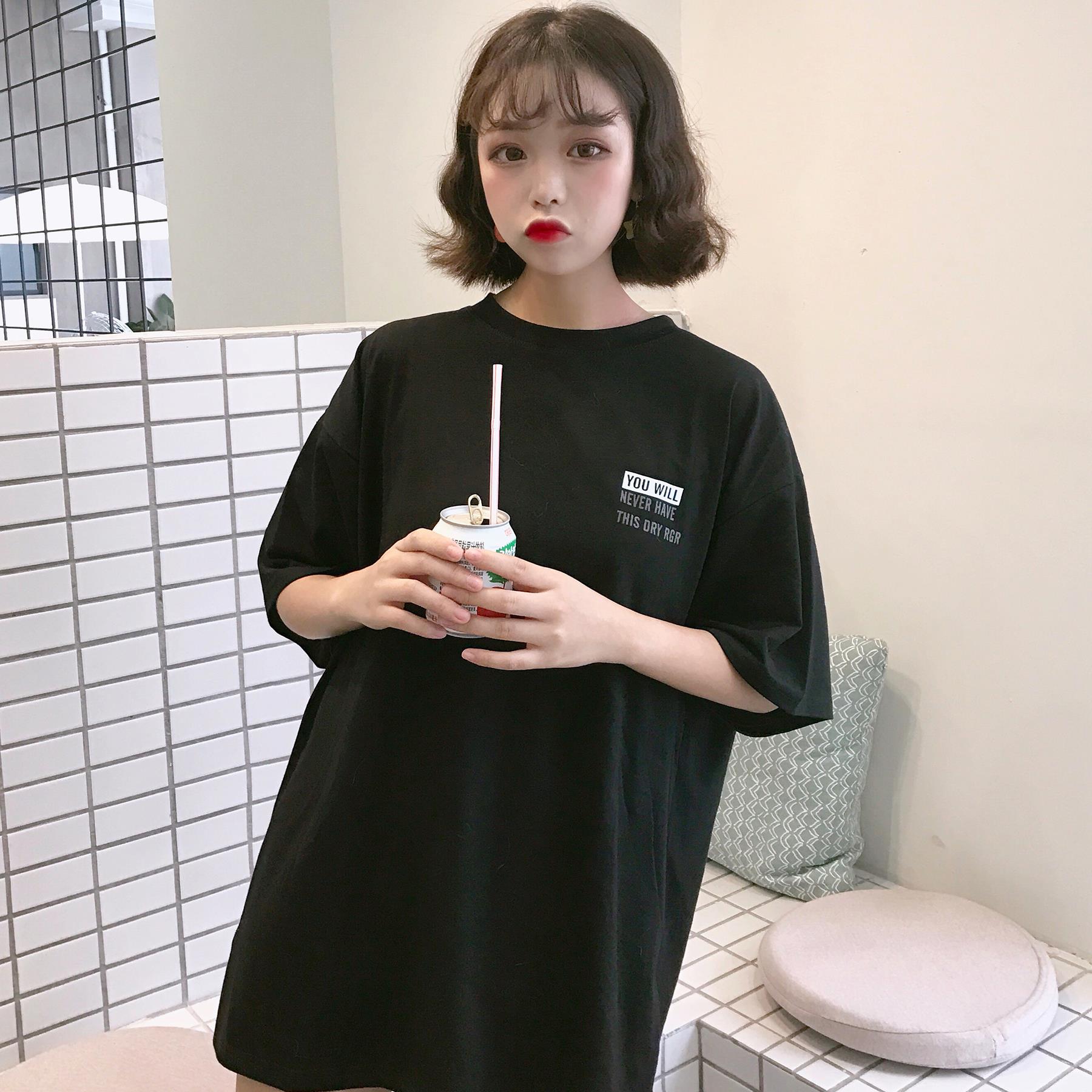 夏季新款女裝中長款簡約復古字母印花寬松顯瘦學生短袖T恤上衣女
