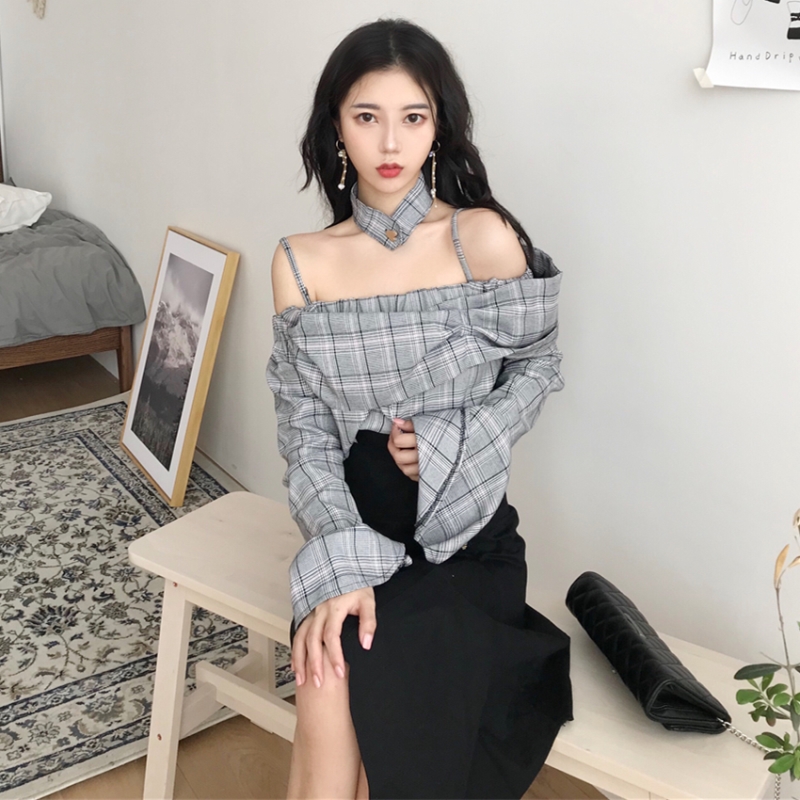 春秋裝女2018新款漏鎖骨一字露肩秋天上衣 港味復古氣質冷系女裝