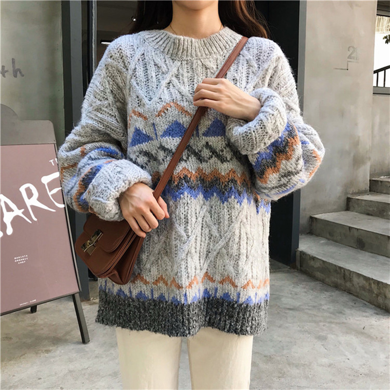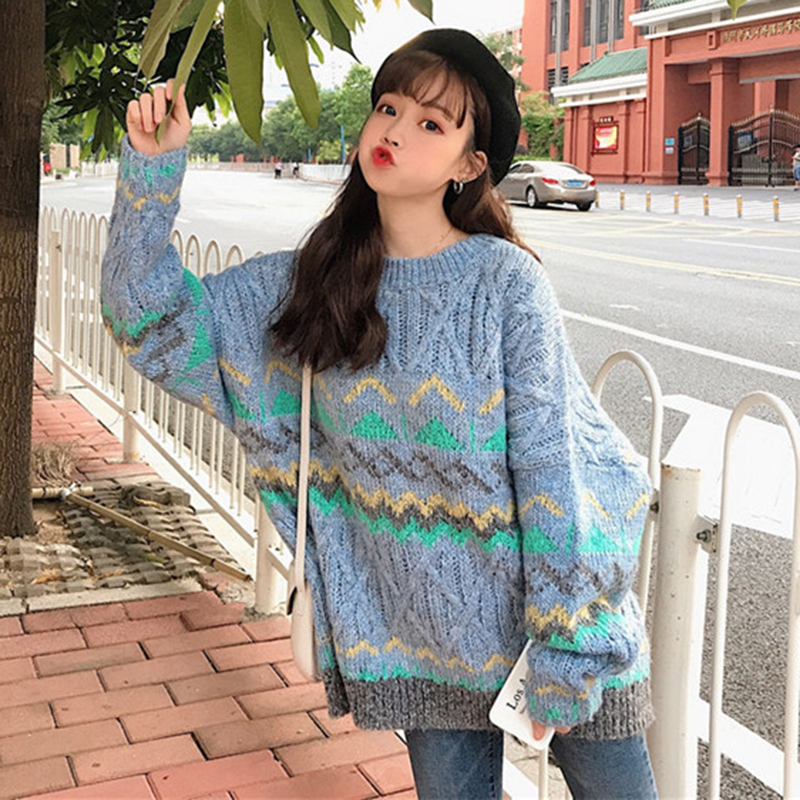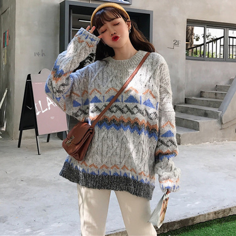 慵懶風撞色菱形毛衣外套女秋冬裝2018新款韓版寬松麻花長袖針織衫