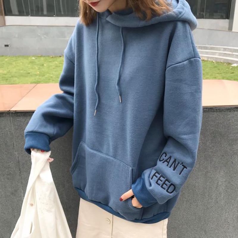 韓版chic加絨連帽衛衣秋冬2018新款女裝慵懶寬松長袖刺繡上衣外套