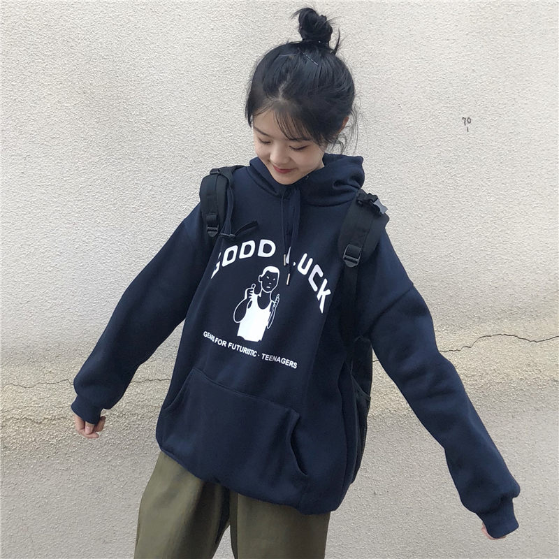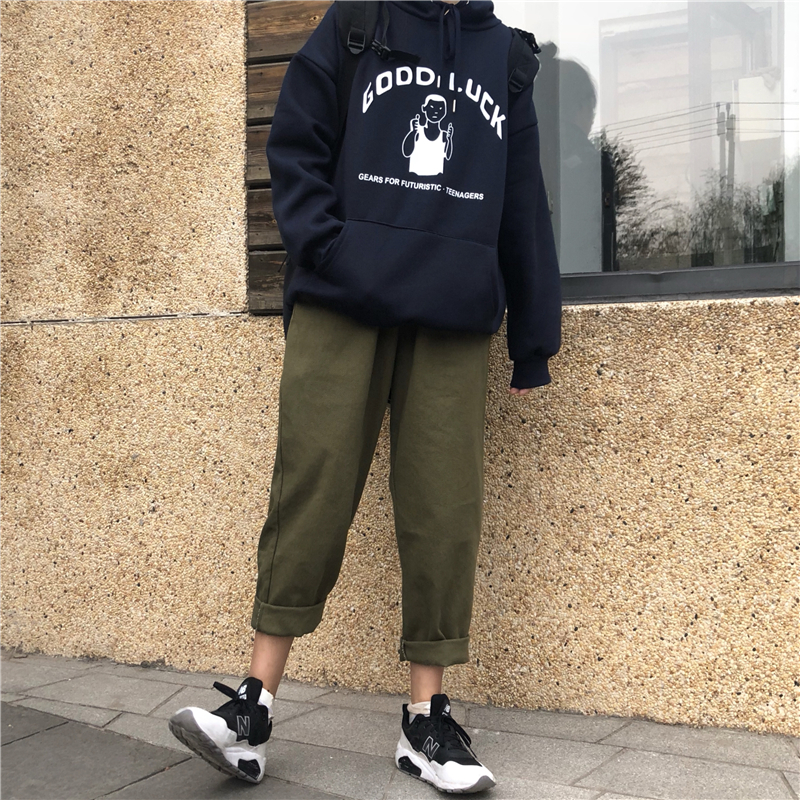 / 韓版時尚休閑套裝秋冬女裝原宿風加絨連帽衛衣+工裝直筒褲兩件套