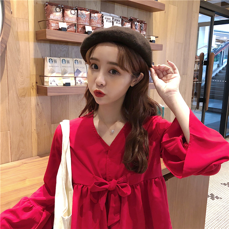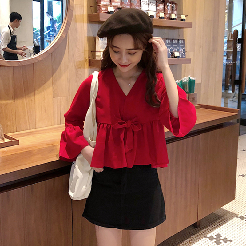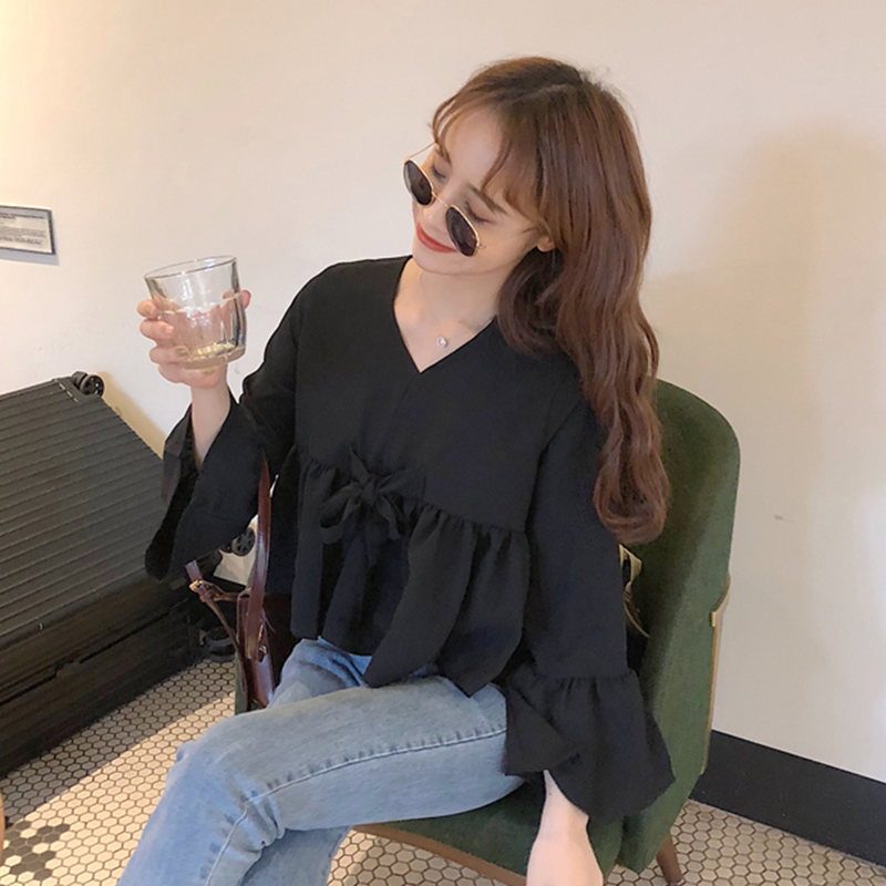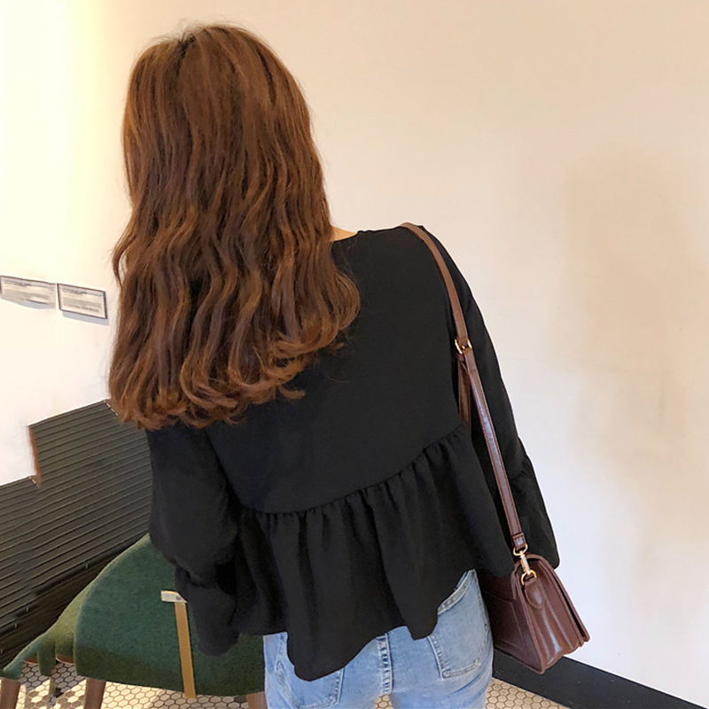 遮肚子雪紡娃娃衫秋裝女2018新款韓版顯瘦V領荷葉袖短款黑色上衣