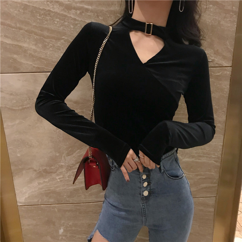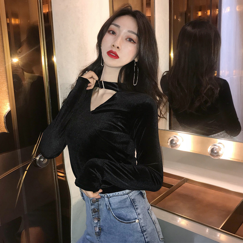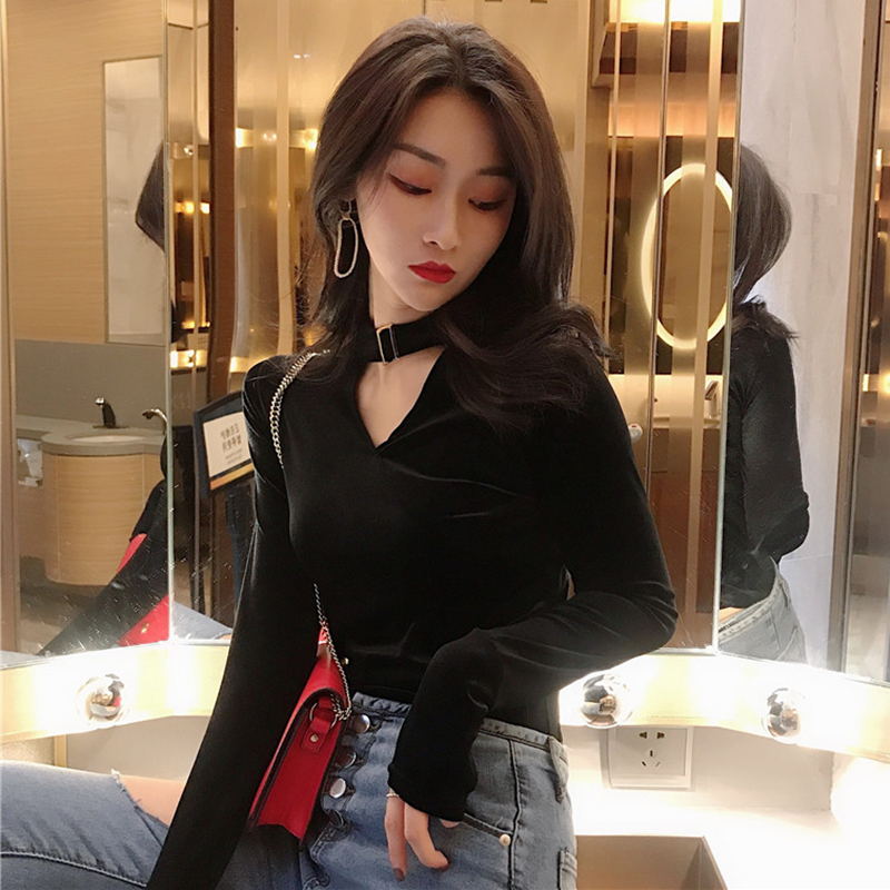 秋裝女2018新款港味chic修身v領金絲絨打底衫氣質長袖T恤黑色上衣