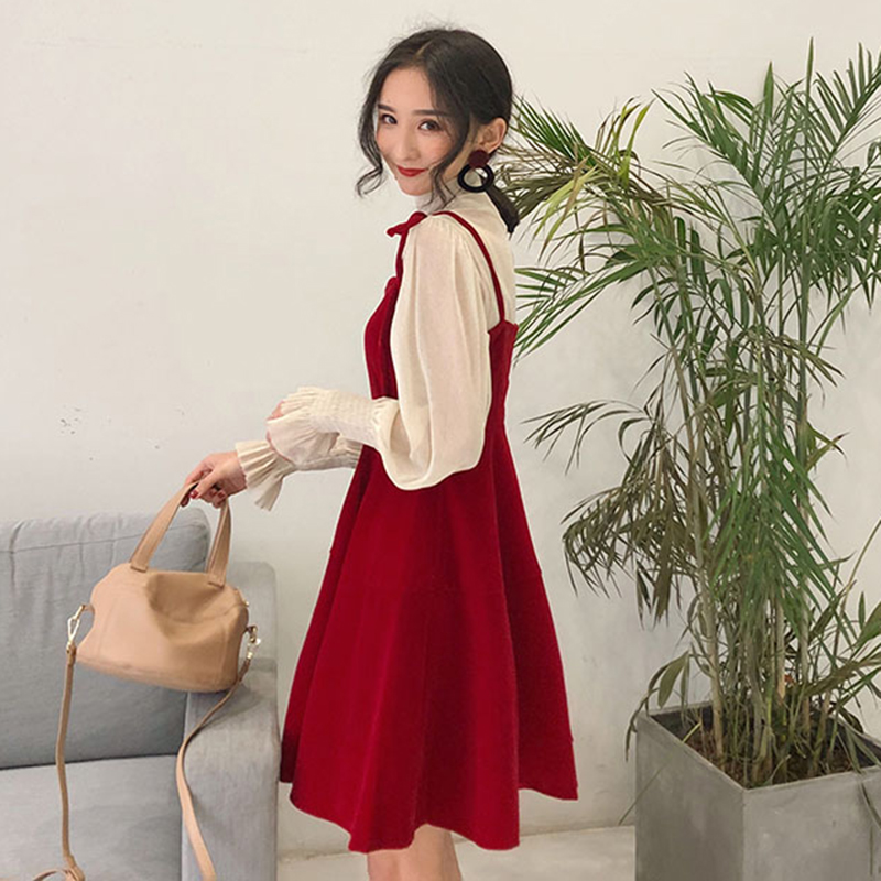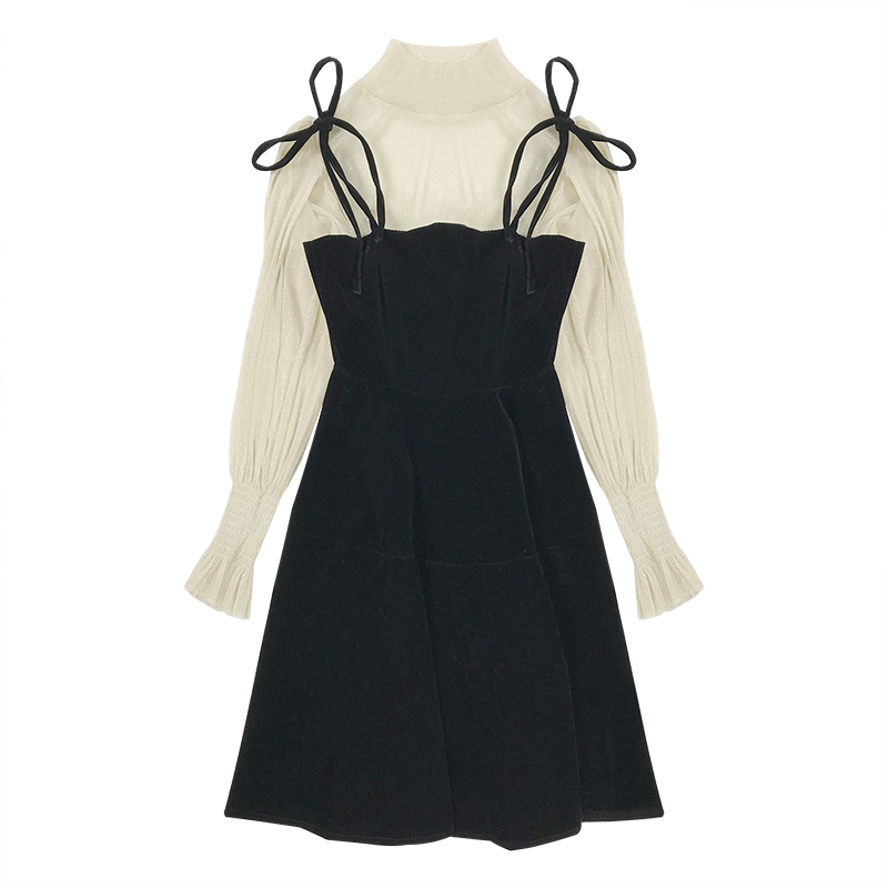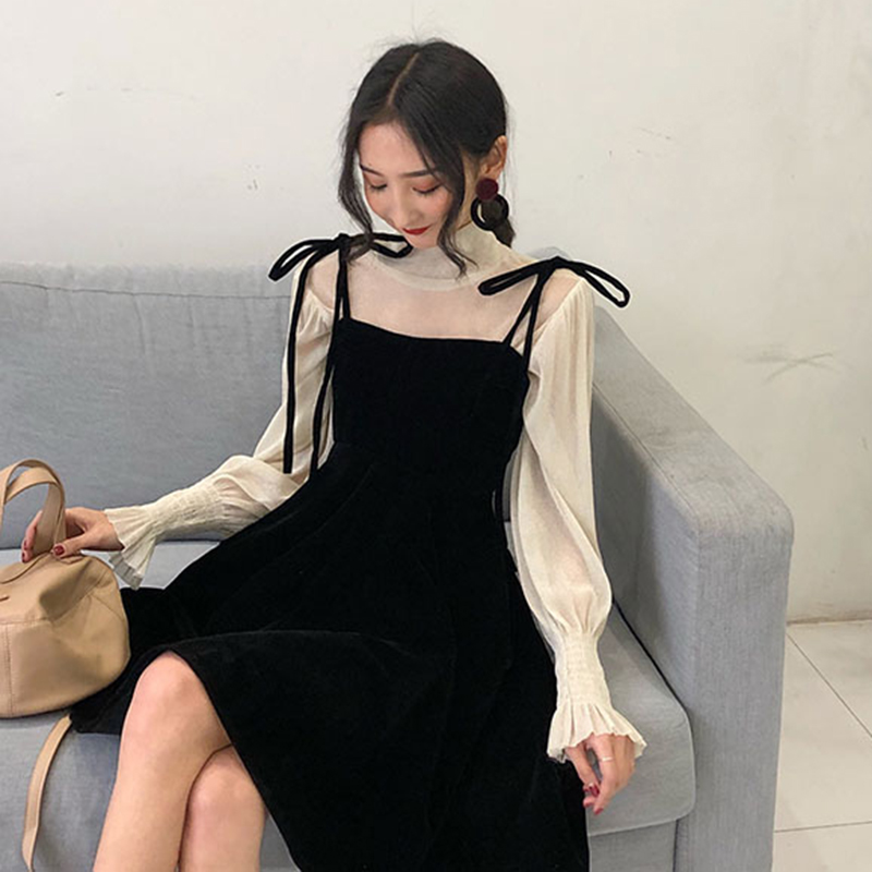 / 時尚套裝女秋冬2018新款高領網紗打底衫高腰黑色吊帶A字連衣裙子