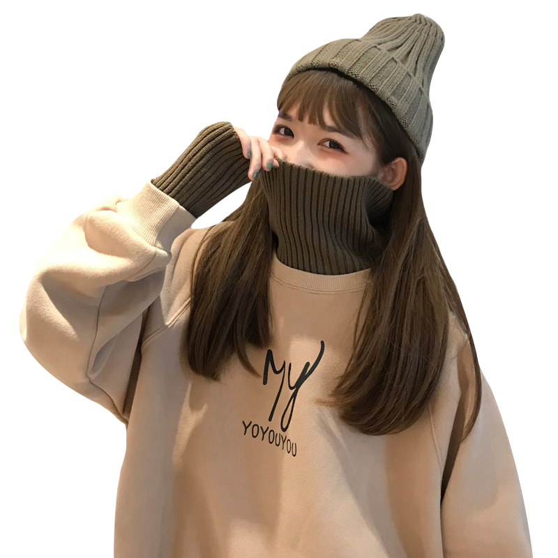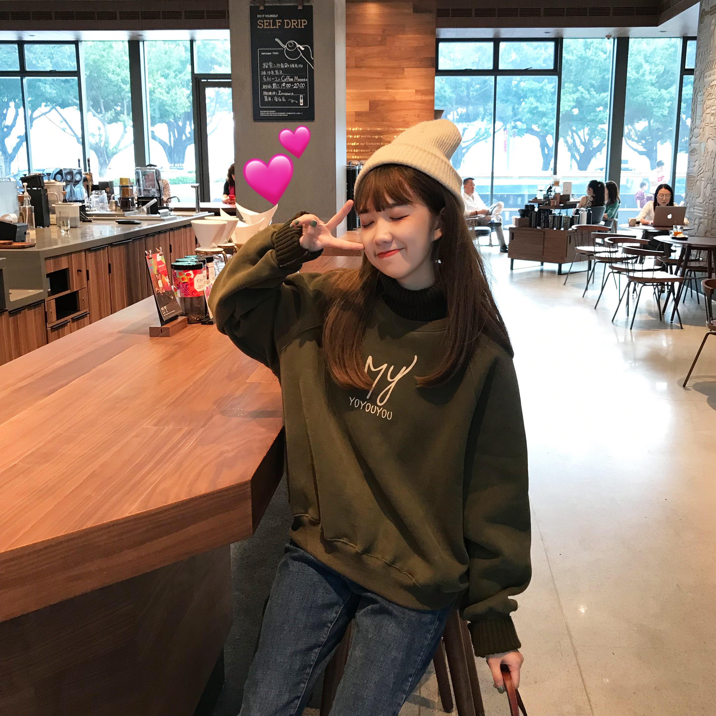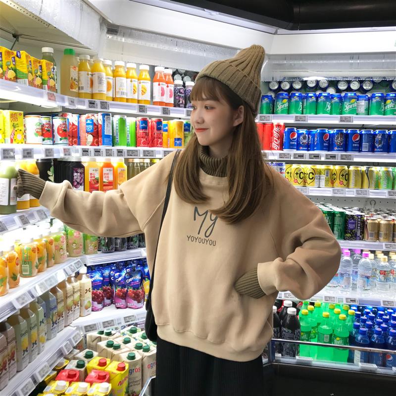 / 秋冬女裝韓版復古寬松字母加絨加厚拼接針織高領套頭衛衣上衣外套