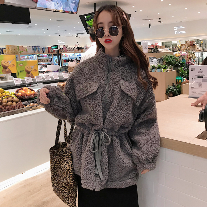 秋冬女裝2018新款學生羊羔毛棉襖外套韓版寬松長袖系帶收腰棉衣服
