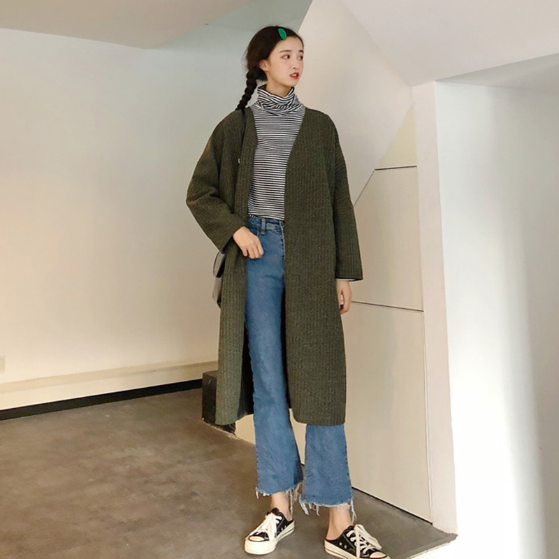 2018秋裝新款韓版純色寬松外套開衫中長款開叉上衣休閑長袖大衣女