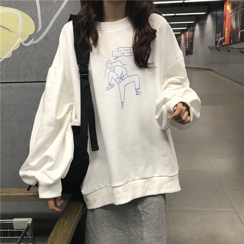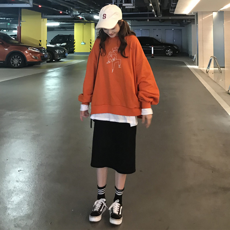 / 早秋新款卡通印花寬松長袖套頭衛衣女裝后開叉a字半身裙子兩件套