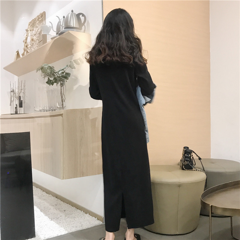 / 長款后開叉裙子女秋冬裝2018新款韓版寬松顯瘦高領長袖打底連衣裙