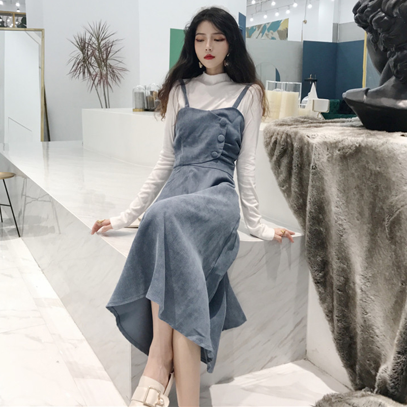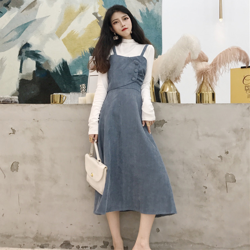 / 兩件套裝女秋冬高腰顯瘦A字吊帶連衣裙子小高領白色長袖T恤打底衫