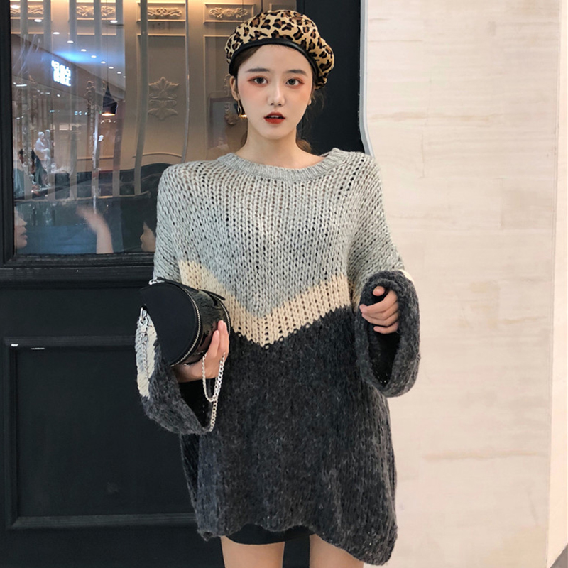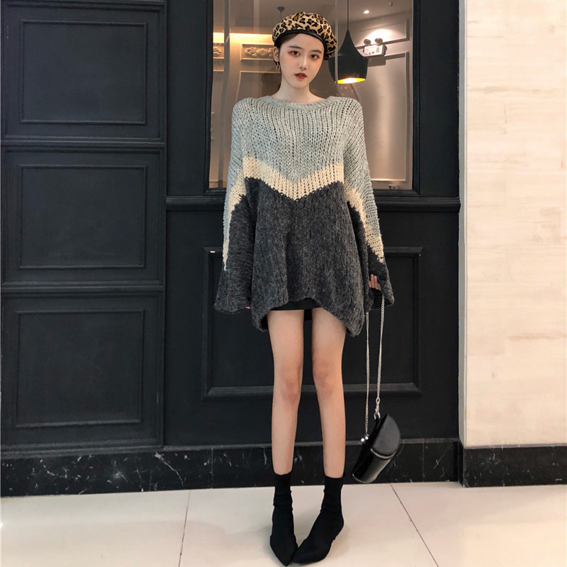 / 慵懶套頭毛衣女秋裝新款甜美撞色粗線針織衫學生寬松長袖外套上衣