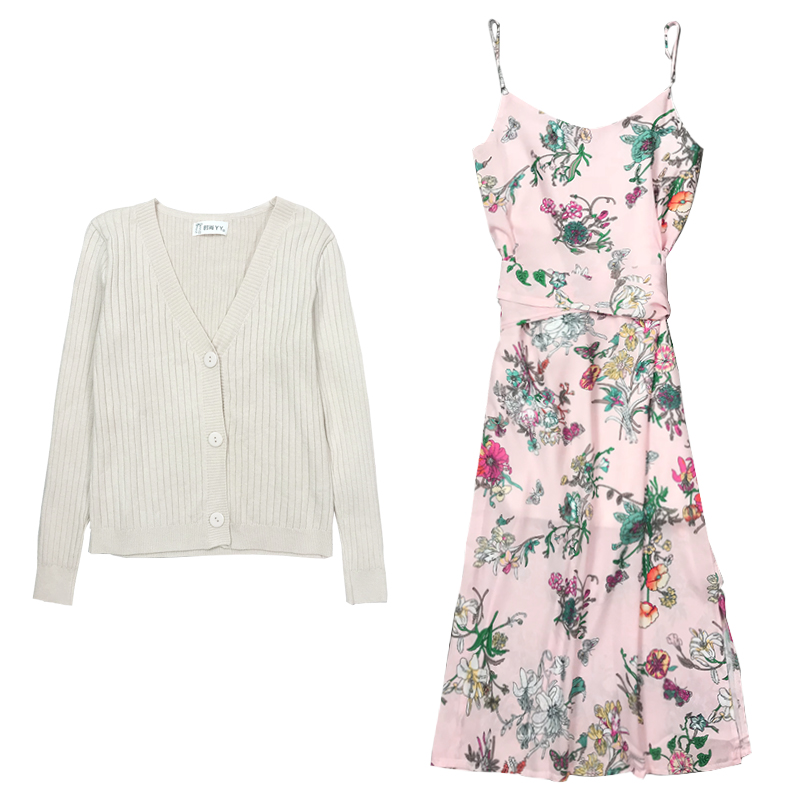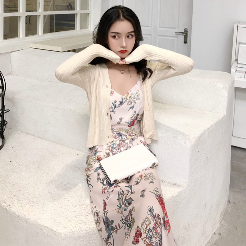 / 早秋新款兩件套裝女氣質綁帶碎花開叉吊帶連衣裙+長袖披肩短外套