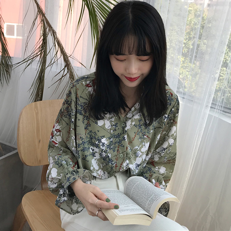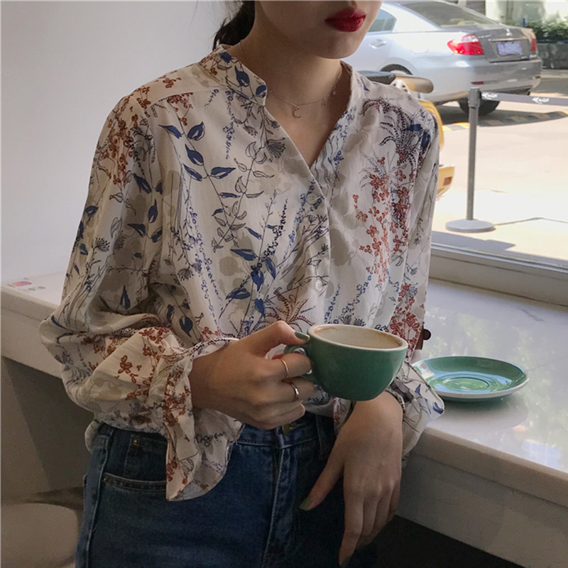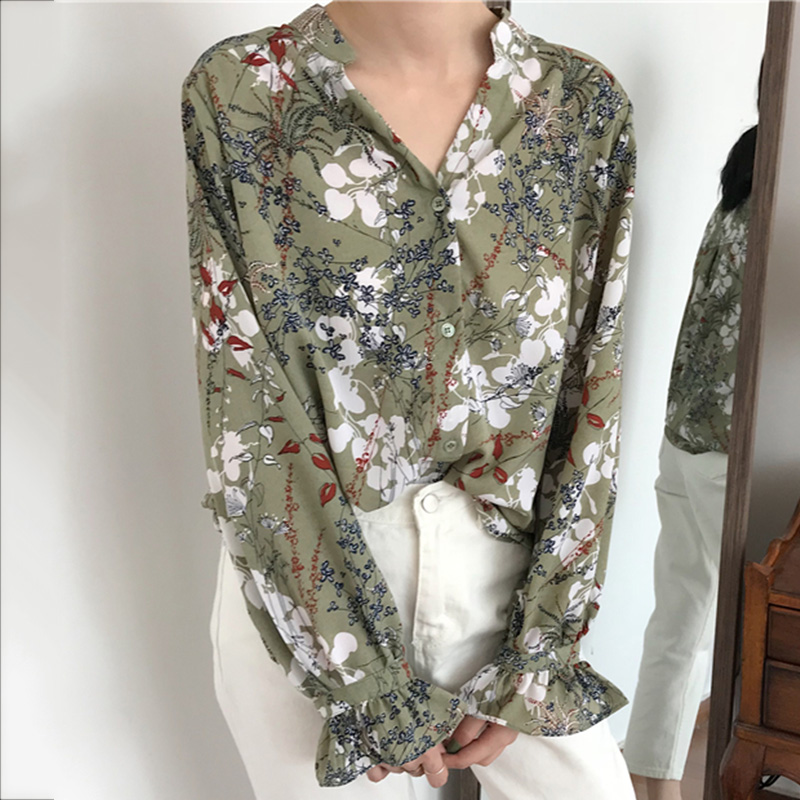 碎花襯衫秋裝新款韓版寬松喇叭袖雪紡上衣仙氣質顯瘦V領長袖襯衫