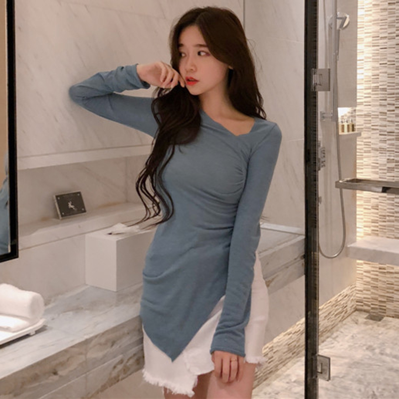 / 港味修身打底針織衫女秋裝新款斜領純色長袖上衣不規則中長款T恤