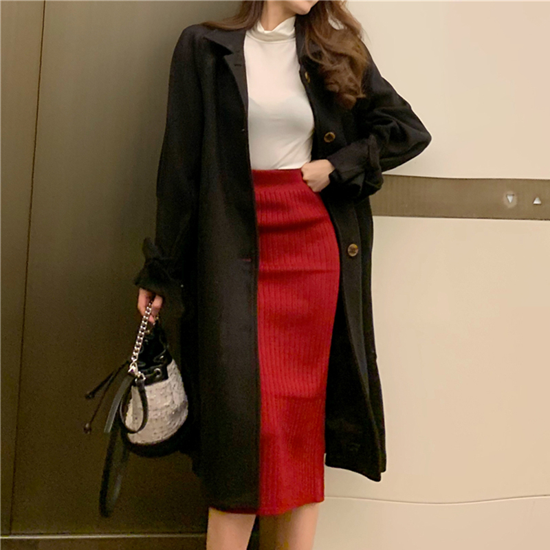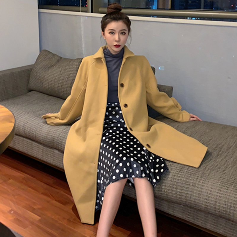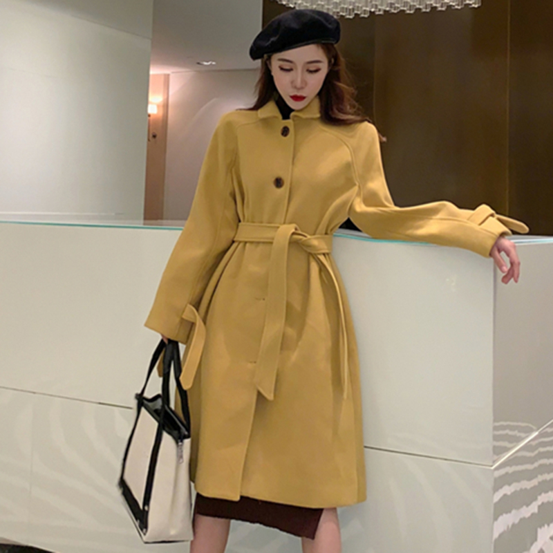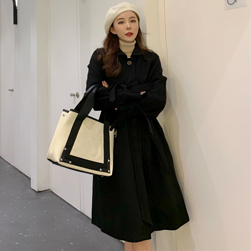 / 風衣女中長款寬松長袖毛呢外套秋冬裝新款系帶收腰流行黑色呢大衣