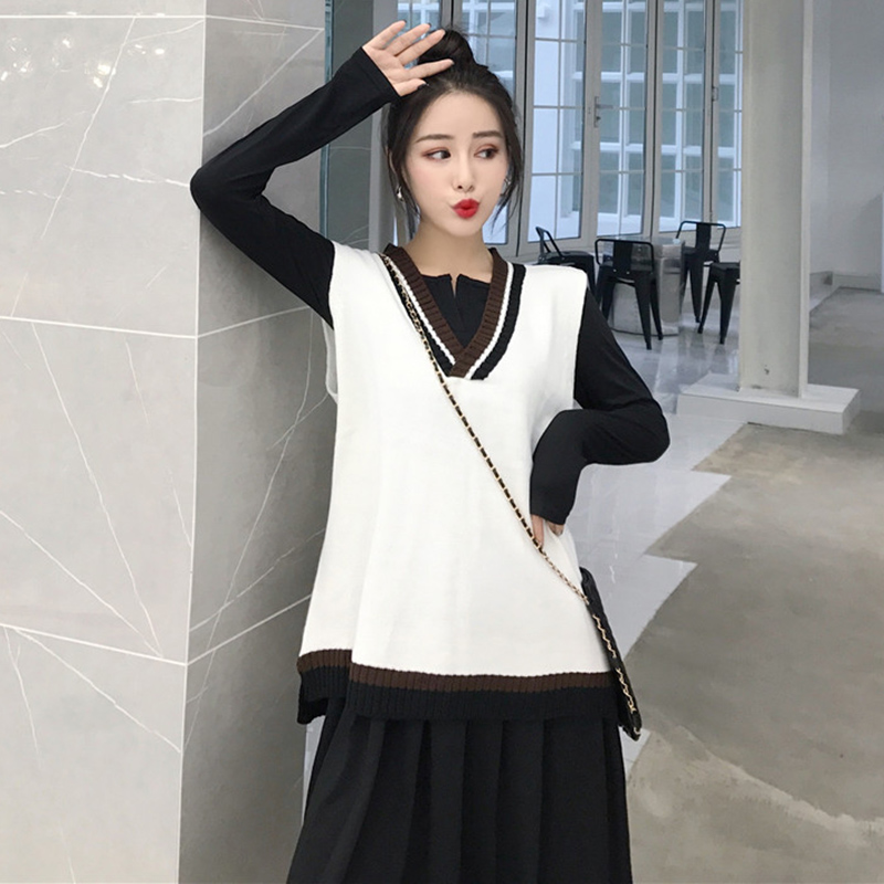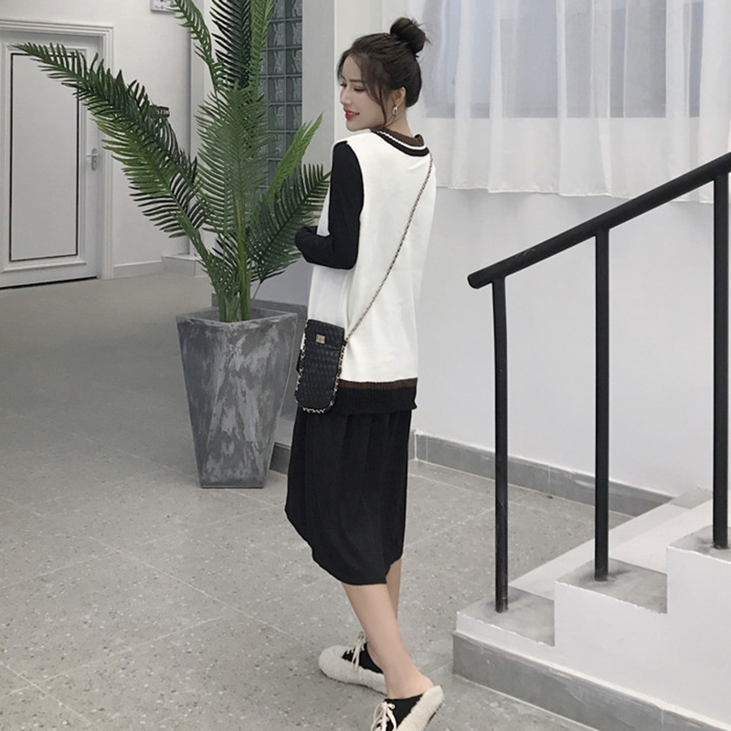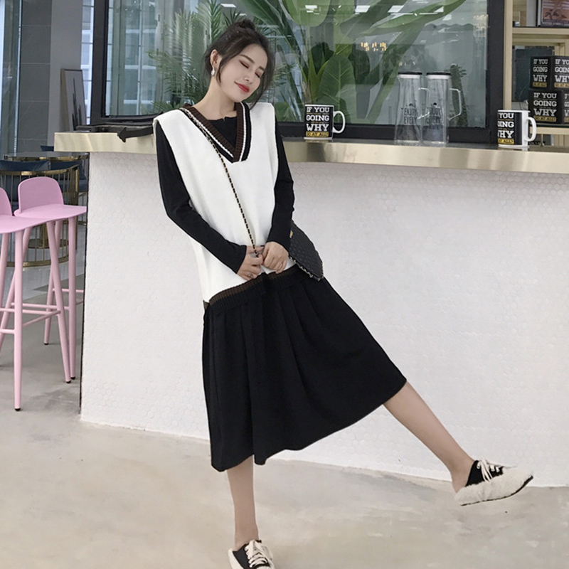 / 毛衣加裙子連件套女秋冬裝新款寬松V領針織馬甲氣質中長款連衣裙