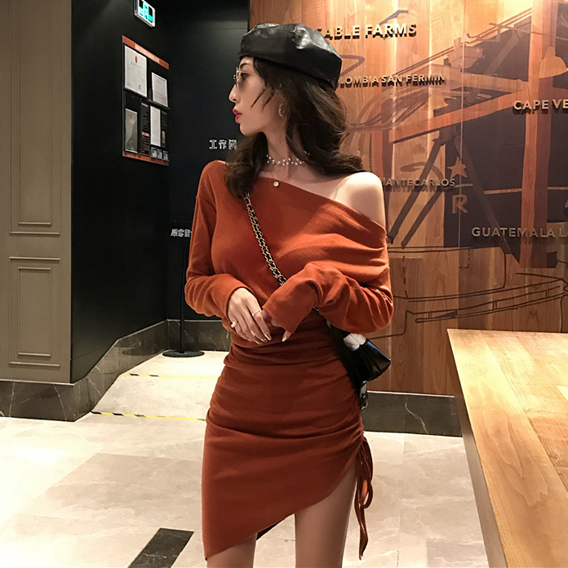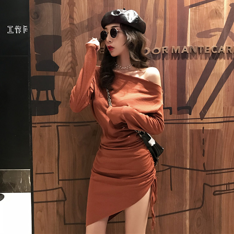 不規則包臀裙女秋裝新款氣質露肩長袖連衣裙子抽繩修身顯瘦小黑裙